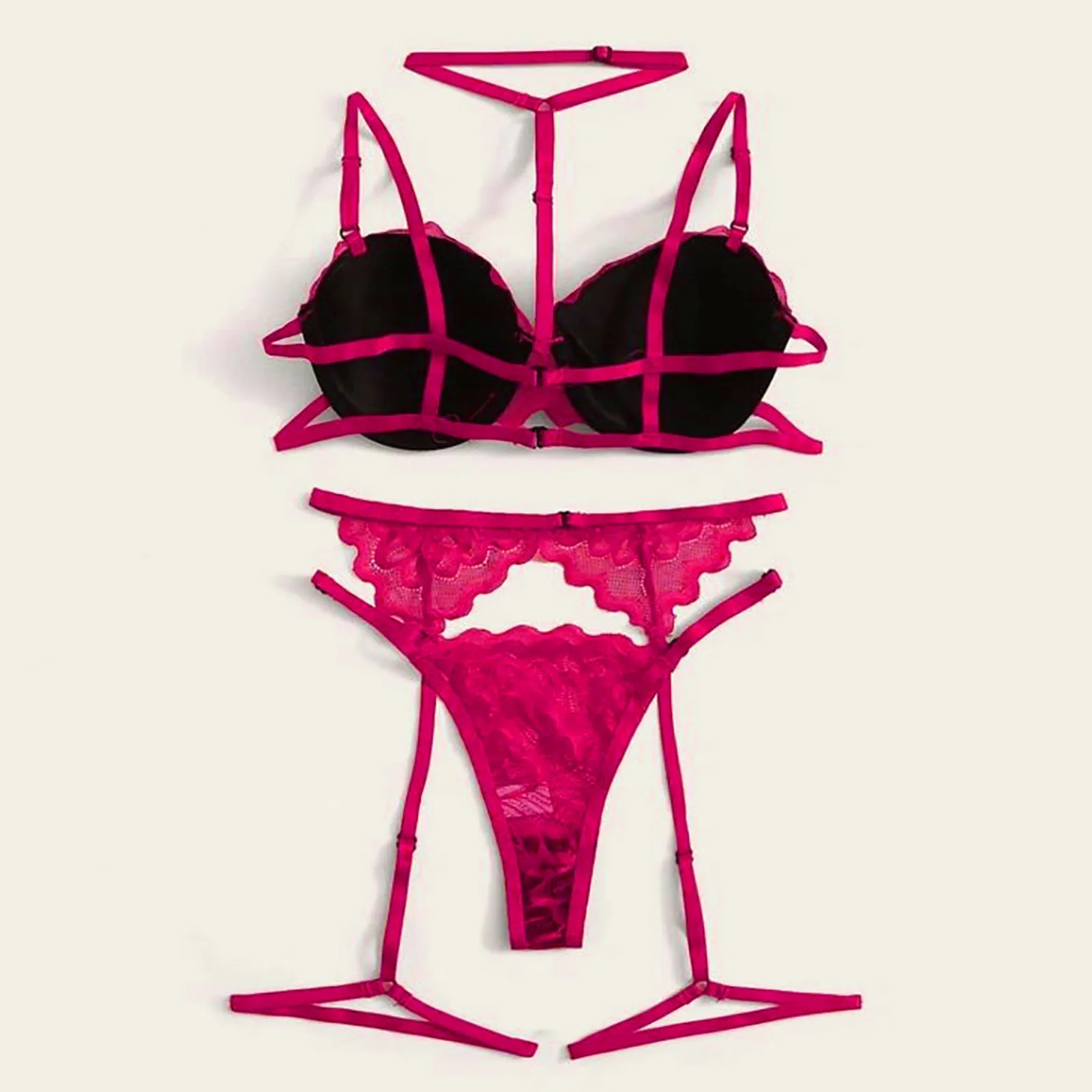 Чувственное женское нижнее белье, кружевной бюстгальтер и подвязки, Комплект трусиков, нижнее белье, комплект из 3 предметов, женское эротическое нижнее белье, женское нижнее белье