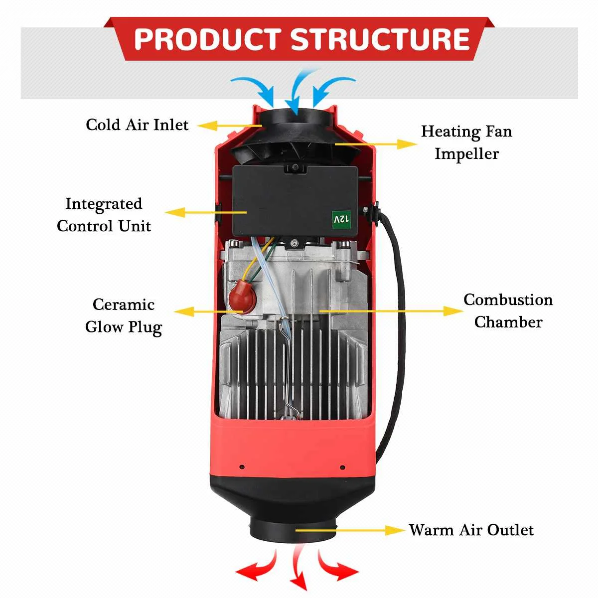 Характеристики:Материал: металл + пластикЦвет: Текстура углеродного волокнаРазмеры: 390 × 150 × 140 мм (15 × 6 × 5,5 ")Напряжение: 12 ВМощность: 8000 ВтТопливо: ДизельПолный коэффициент сгорания: 100%Расход топлива: 0,1 ~ 0,24 лРабочая температура: -40 °C ~ 80 °C