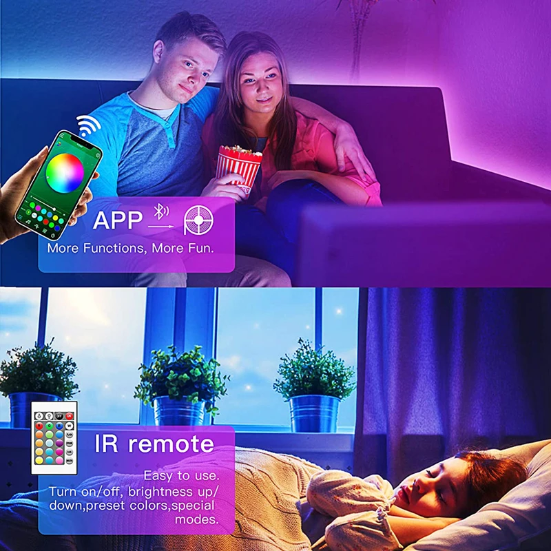 Полный комплект 5 м: Светодиодная лента 5 м + управление + блок питания 12 В 3 АПолный комплект 10 м: Светодиодная лента 2x5 м + управление + блок питания 12 В 5A + соединительный кабель 1to2