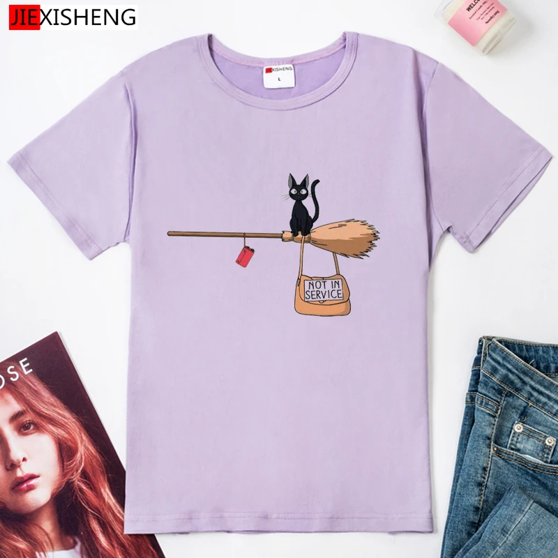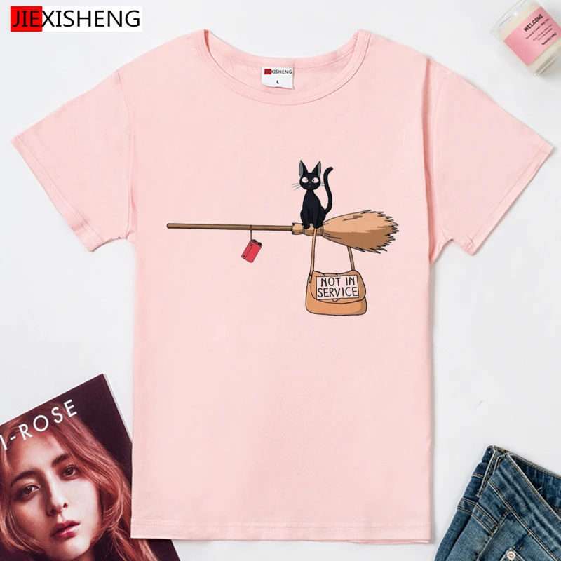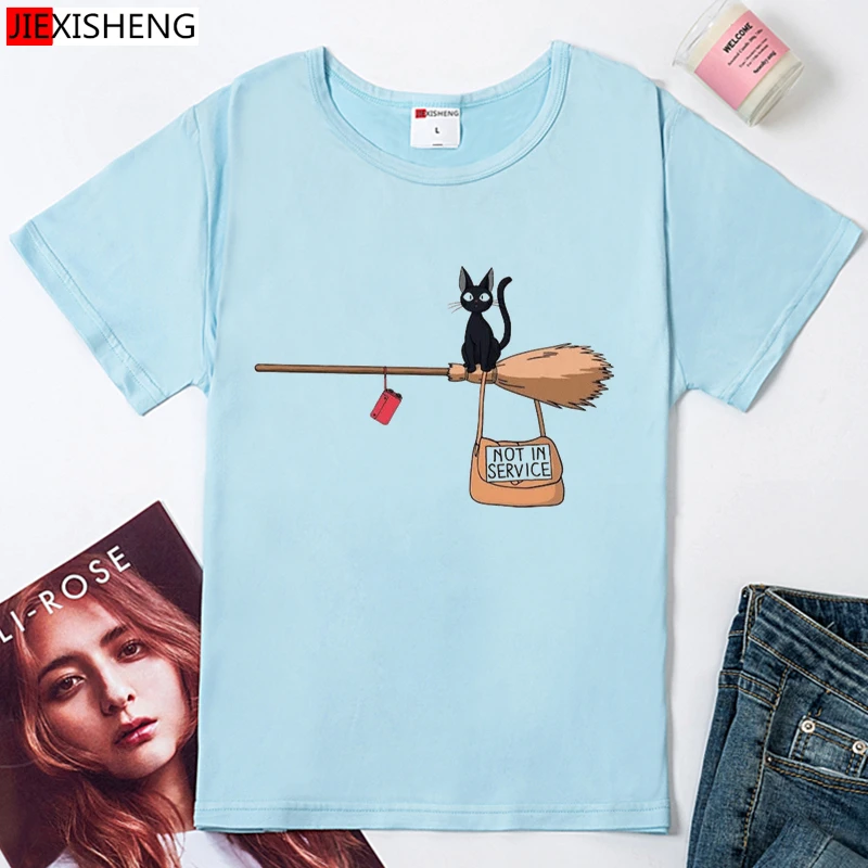 Женская футболка с принтом в виде маленького черного кота, летняя футболка с изображением героя мультфильмов
