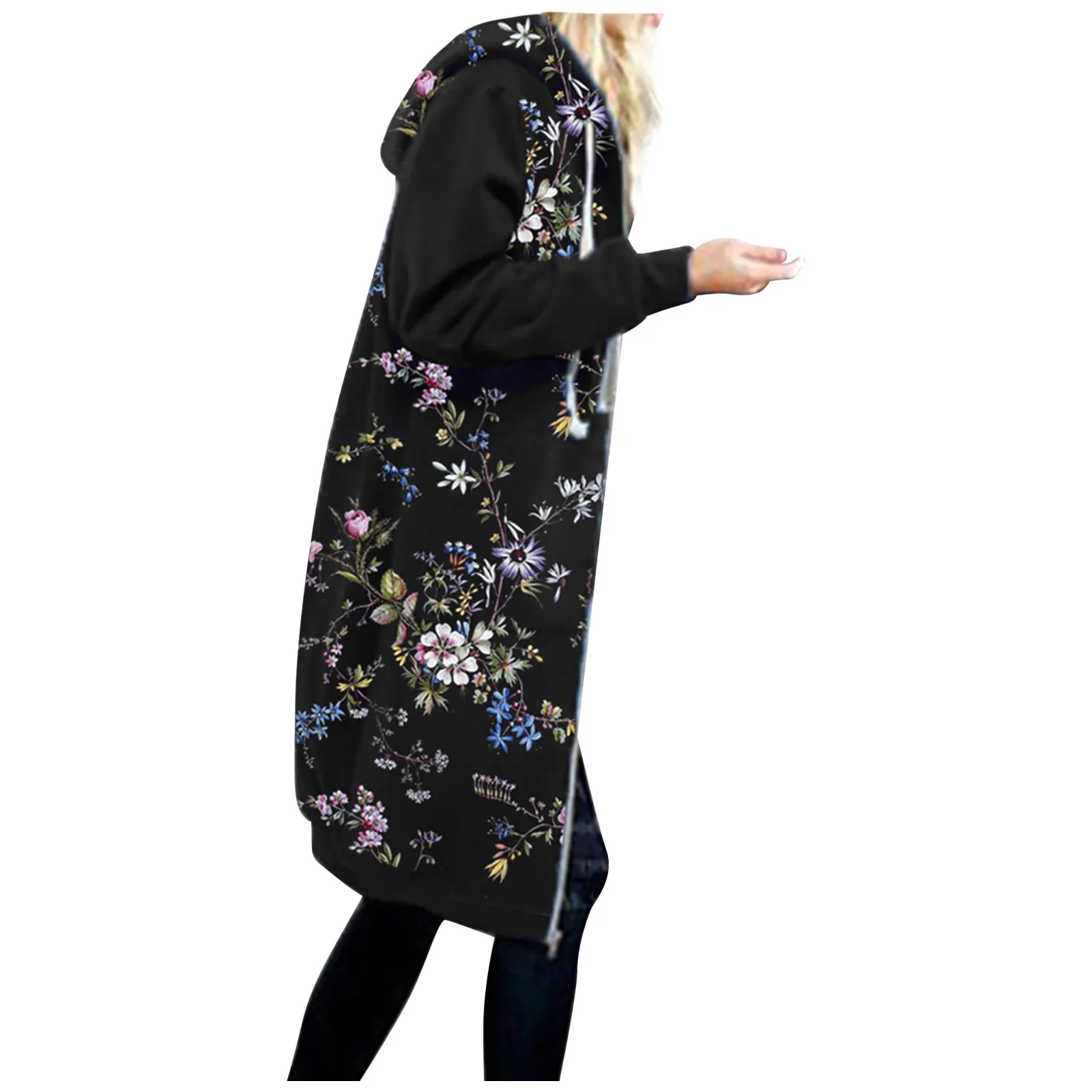 Женская теплая толстовка с капюшоном с цветочным принтом на молнии, хлопковый кардиган, пальто, длинная верхняя одежда