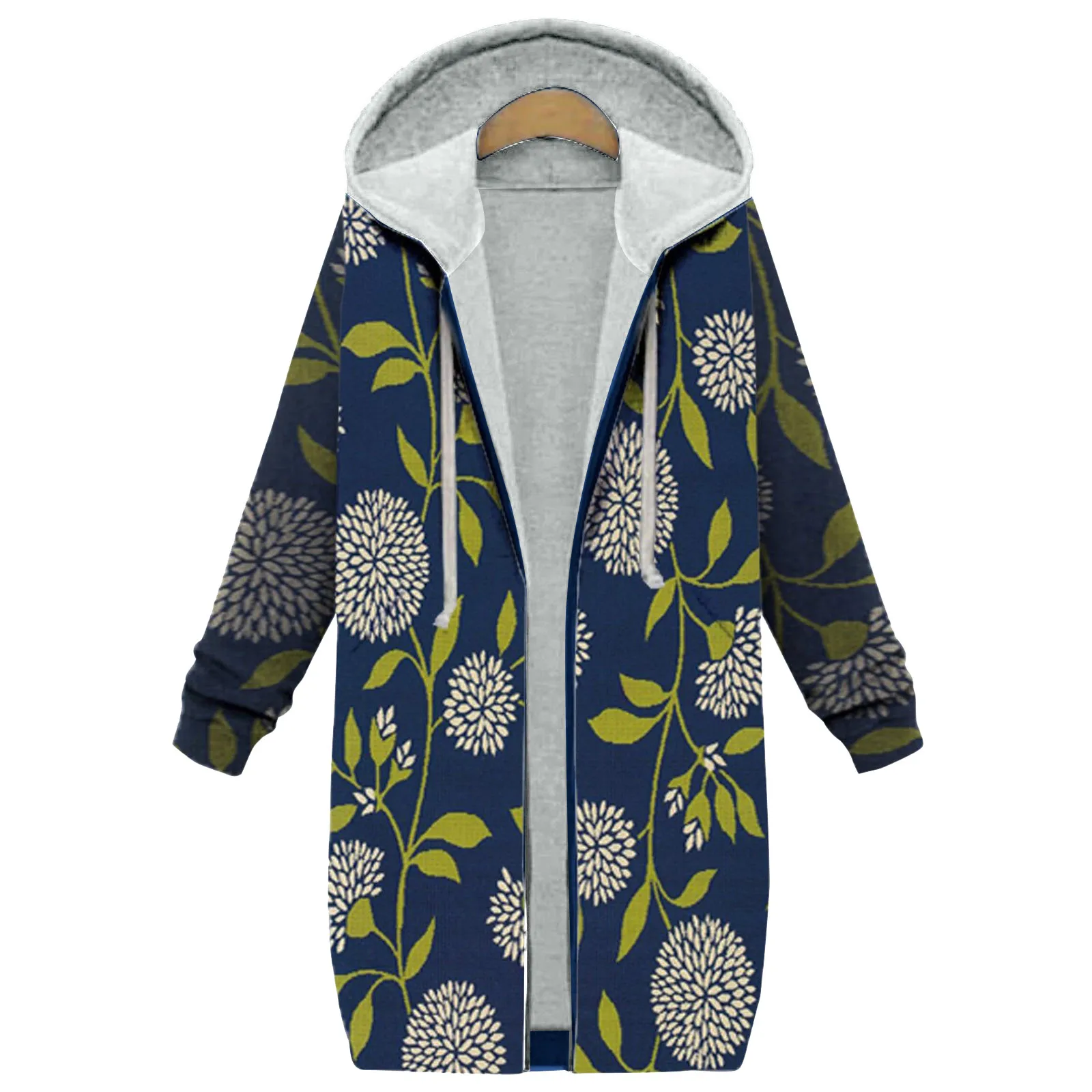 Женская теплая толстовка с капюшоном, длинный зимний бархатный теплый кардиган на молнии с длинными рукавами и цветочным принтом