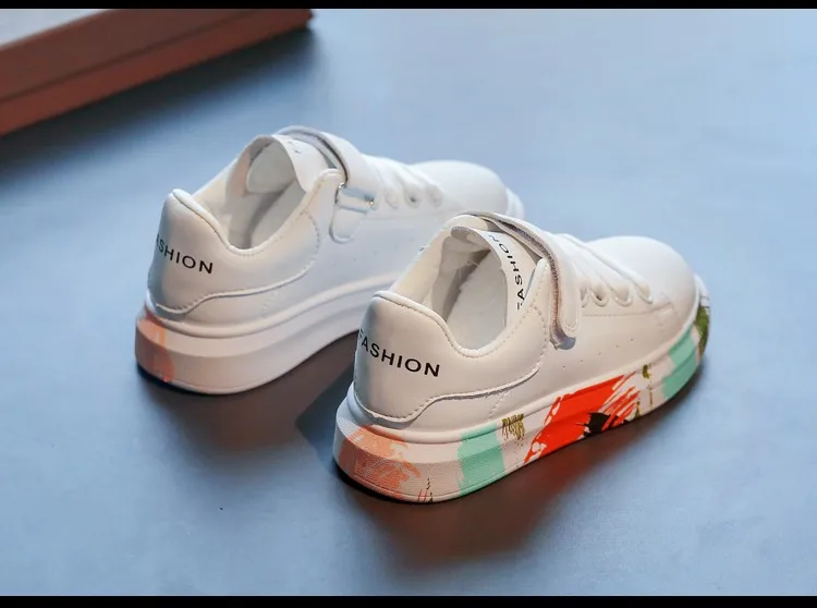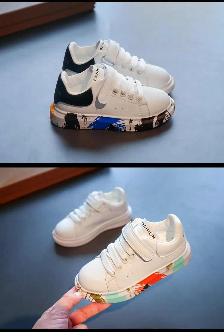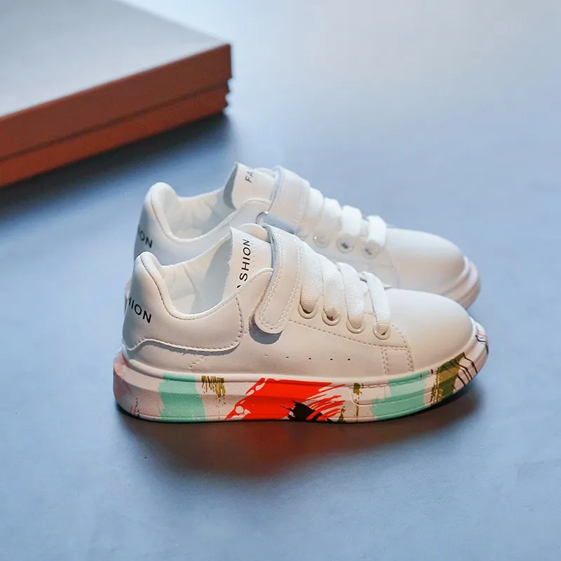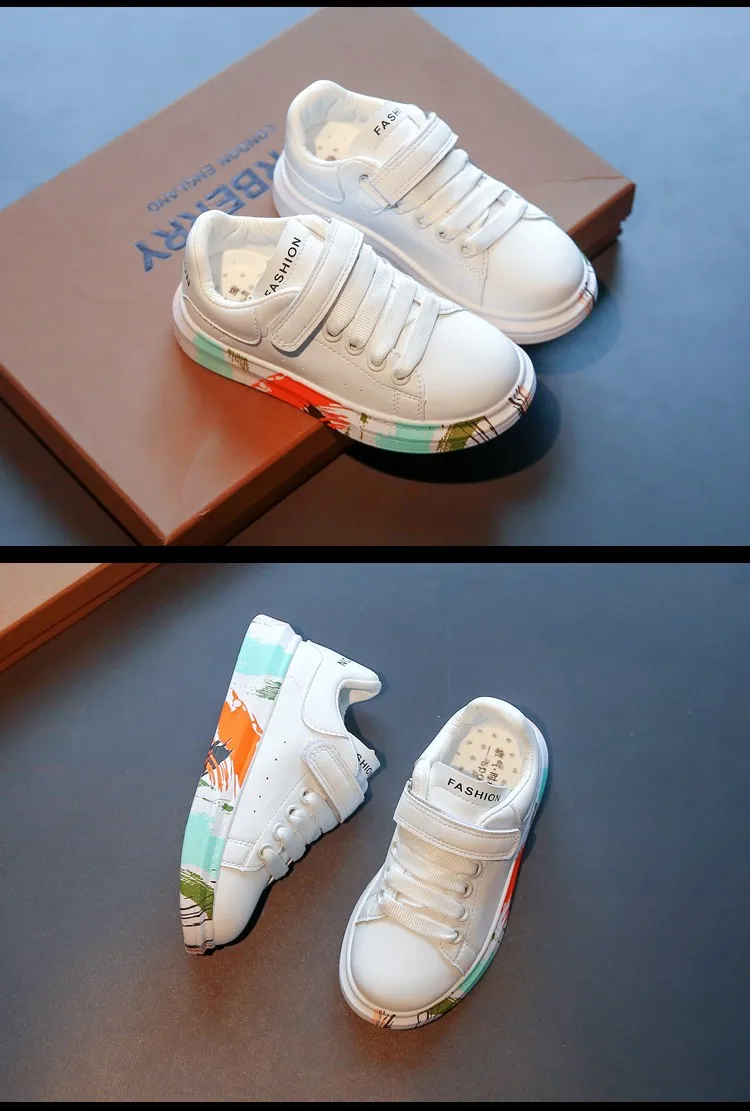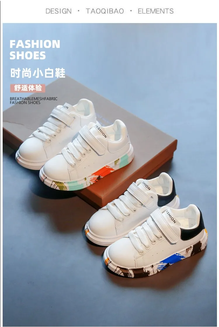 Кроссовки Детские с круглым носком, удобная повседневная обувь с граффити, художественная подошва, модные спортивные, для мальчиков и девочек, белые, Размеры 26-37, осень