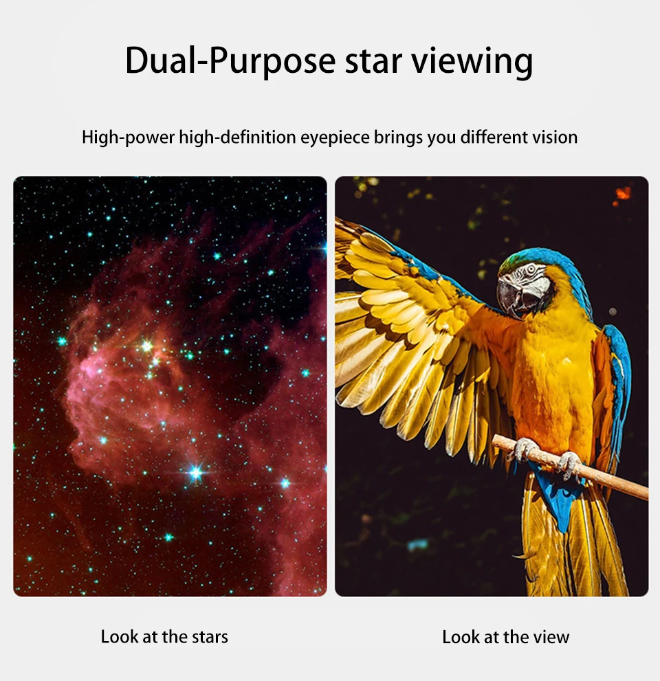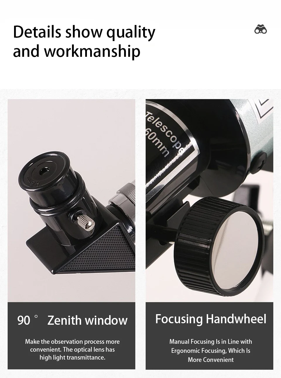 Более профессиональный, более мощный1. Фокусное расстояние: 600 мм2. Увеличение: 50-100 раз3. Окуляр: H6 мм, h12 мм4. Штатив: Выдвижной