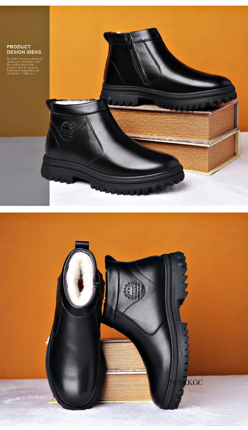 Мужские ботинки из натуральной кожи, Черные Водонепроницаемые рабочие ботильоны с натуральным мехом, теплая обувь для снега, зима 2021