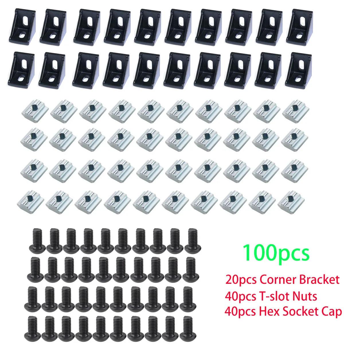 100 шт. 2020 алюминиевый профиль набор коннекторов 20 шт. угловой кронштейн + 40 шт. 20 серий M5 Т-образные гайки + 40 шт. m5x8 мм шестигранный гнездо E