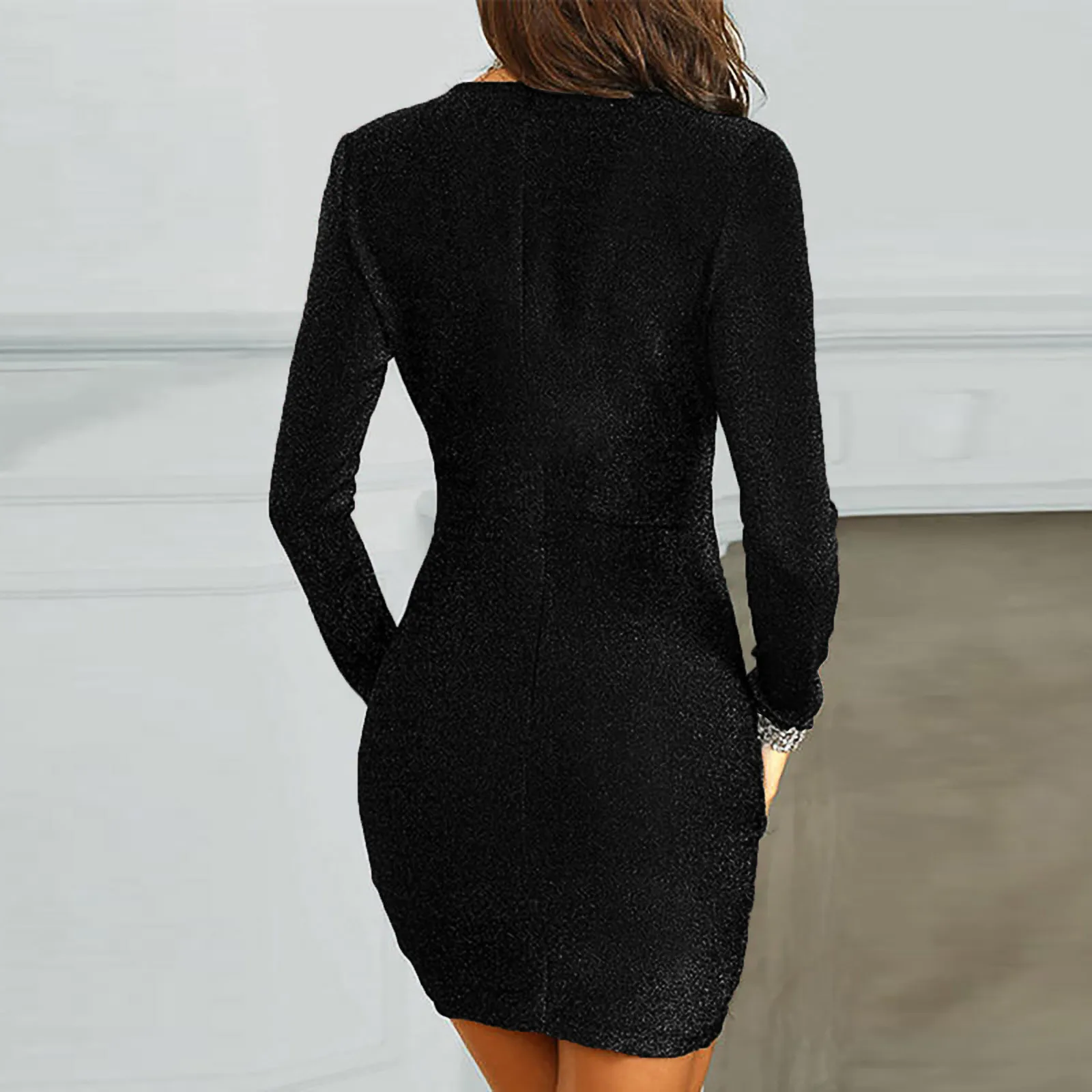 Женское платье, модное, однотонное, с v-образным вырезом, с блестками, с длинным рукавом, вечерние мини-платья