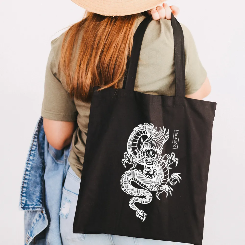 Женская Холщовая Сумка с аниме-принтом дракона, вместительная Хлопковая сумка для покупок в стиле Харадзюку, черная белая Готическая стильная сумочка в стиле панк