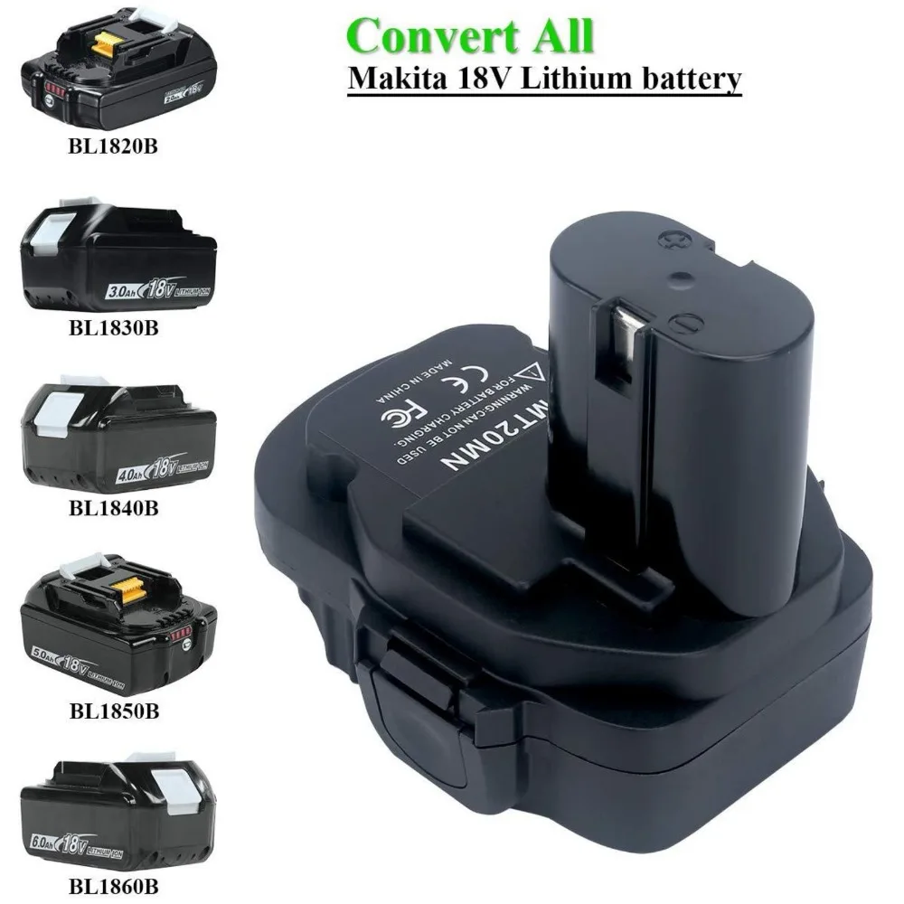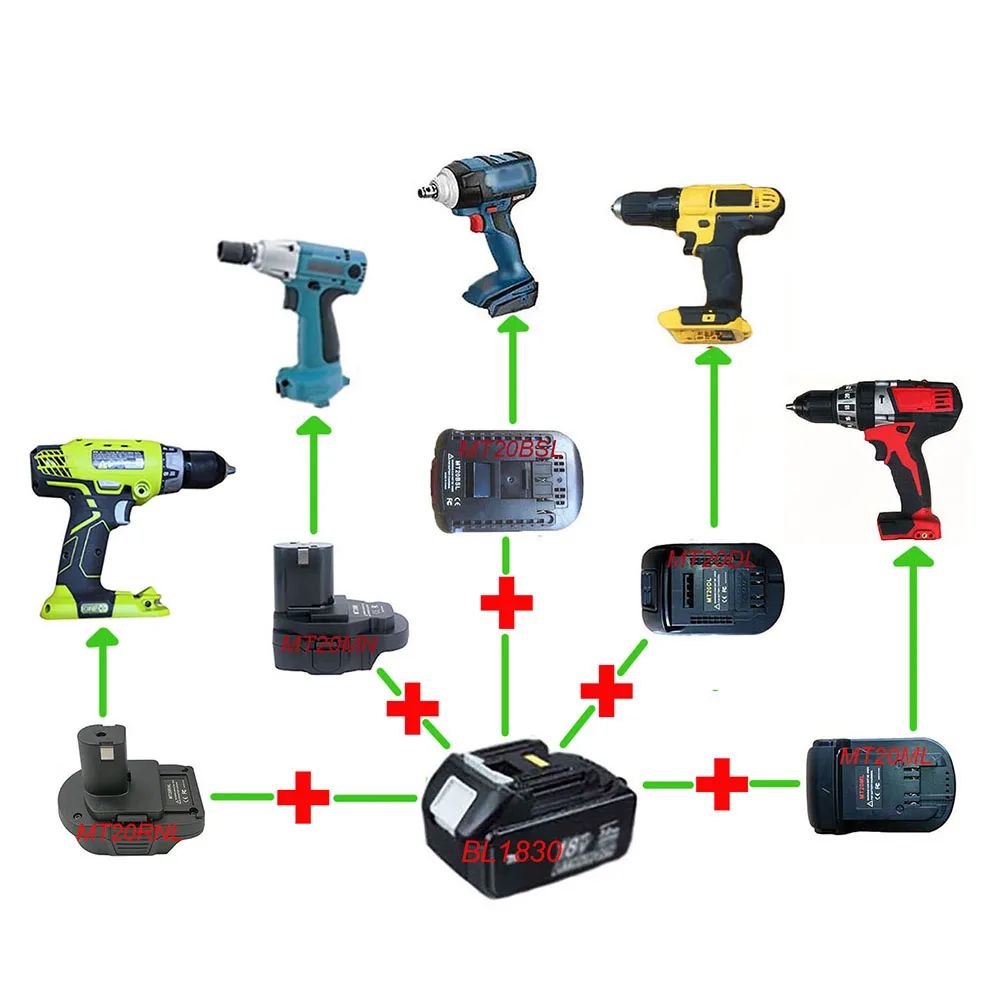 С адаптером (MT20BSL, MT20DL, MT20ML, MT20MN. MT20RNL), вы можете использовать литий-ионную батарею Makita 18V BL1830 BL1860 на Milwaukee, Bosch, Dewalt, инструменты для литиевых батарей или Makita, Ryobi никелевый аккумулятор: