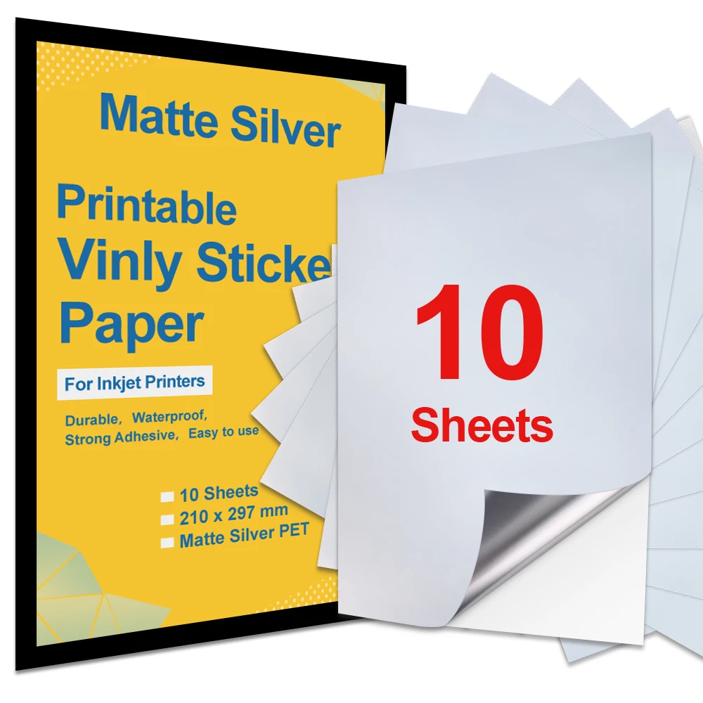 10 листов клейких этикеток A4 Виниловая наклейка для печати ПЭТ Бумага Матовая Серебристая бумага A4 Водонепроницаемая копировальная бумага для струйного принтера