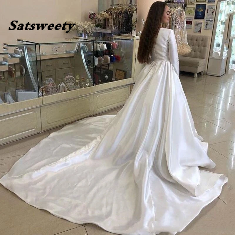 Платье свадебное атласное с длинным рукавом и шлейфом, белое