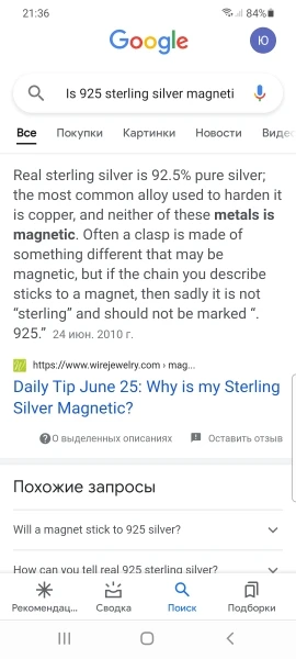 Проба не соответствует описанию. Продавец Лгун это не серебро шармы сильно магнитяться , я подала на спор а продавец говорит что это нормально и примеси в виде 7.5% могут притягиватся магнитом Это вранье! Научно доказанный факт что серебро 92.5% не магнитится!