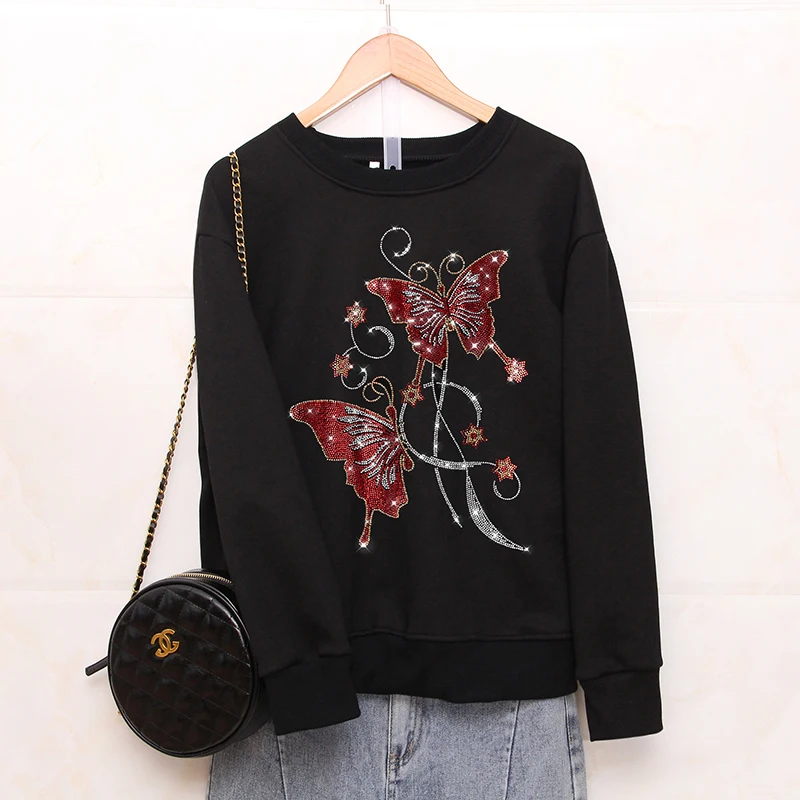 Весенне-осенние модные свободные кофты женские творческие бабочки Горячие бриллианты Узор повседневные женские топы с круглым вырезом пуловеры
