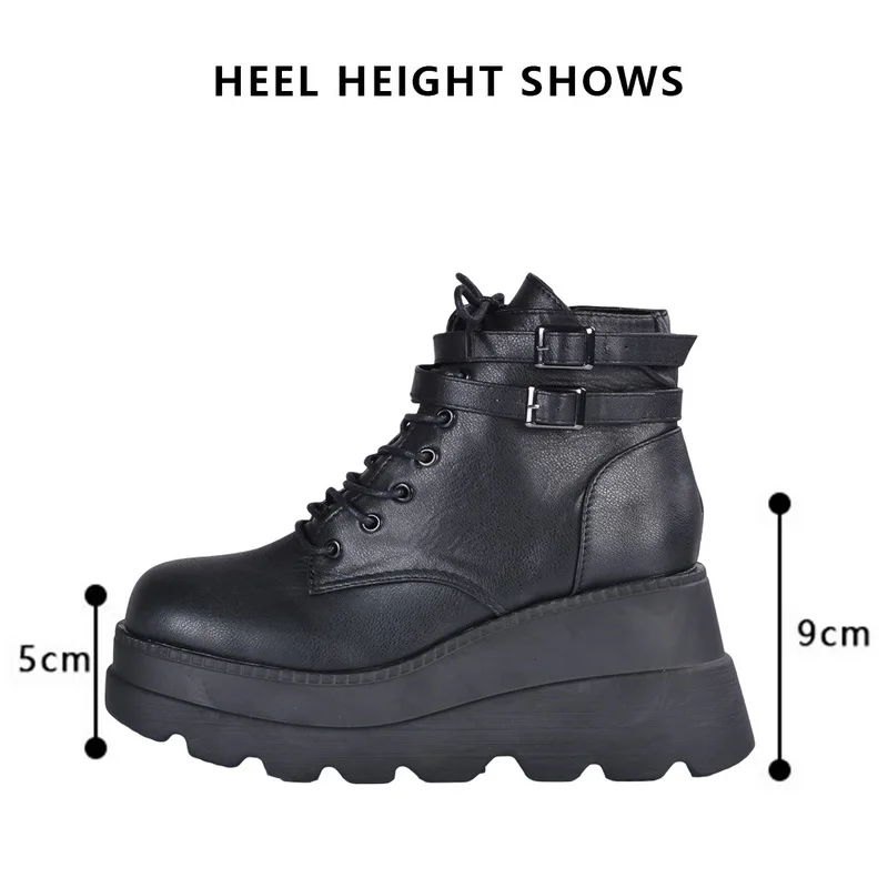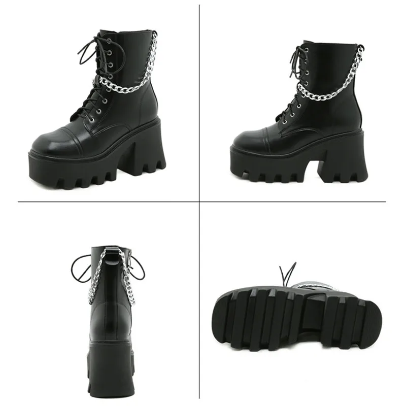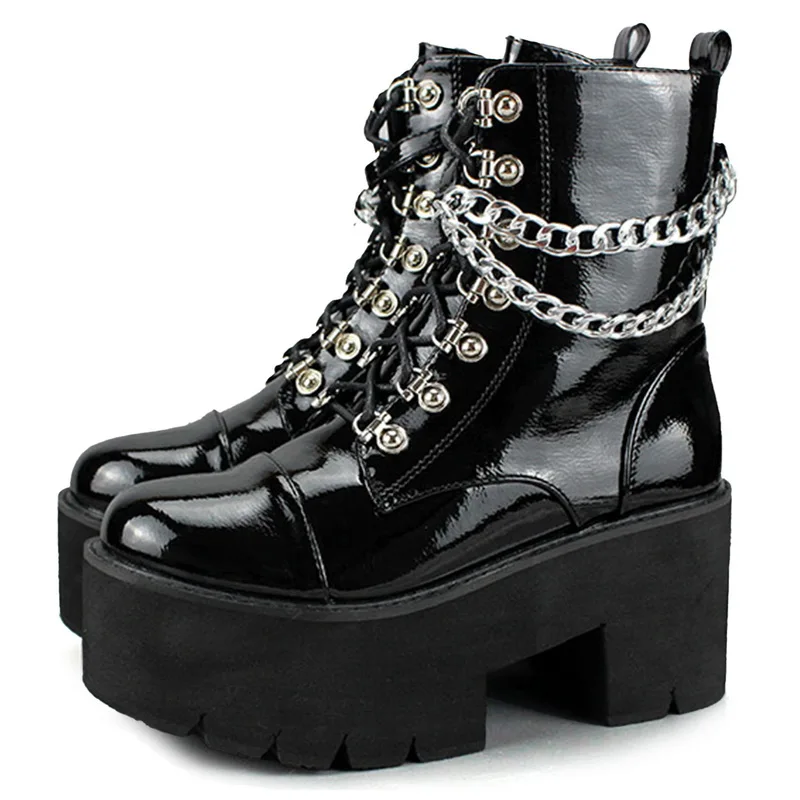 Ботинки женские из лакированной кожи, на платформе, высокий каблук, готические ботинки на танкетке, с цепочкой, обувь в стиле панк, байкерские ботинки