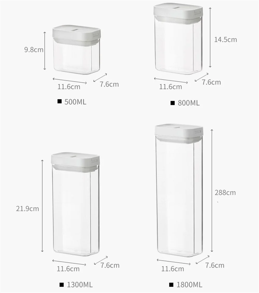 -Прозрачная коробка для хранения очень подходит для аккуратного хранения различных продуктов, таких как печенье, мука, сахар, закуски, принадлежности для выпечки, корм для домашних животных, кофе, сахар, рис, специи, чай, орехи, бобы, макароны и другие продукты.