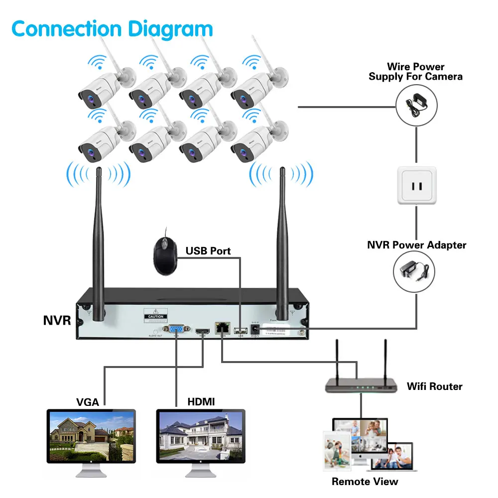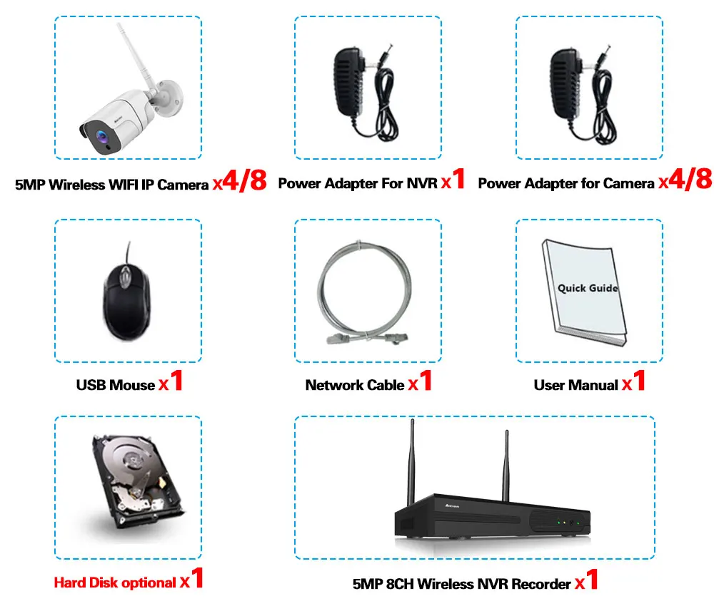 1X 8-канальный 5-мегапиксельный Беспроводной Wi-Fi видеорегистратор;4/8x Ultra HD 5 Мп беспроводная Wi-Fi цилиндрическая IP-камера;4/8x блок питания для камеры;1 источник питания для сетевого видеорегистратора;1 USB-мышь (подарок);1x3 фута 1 м кабель Ethernet (подарок);1 Краткое руководство;Жесткий диск опционально!