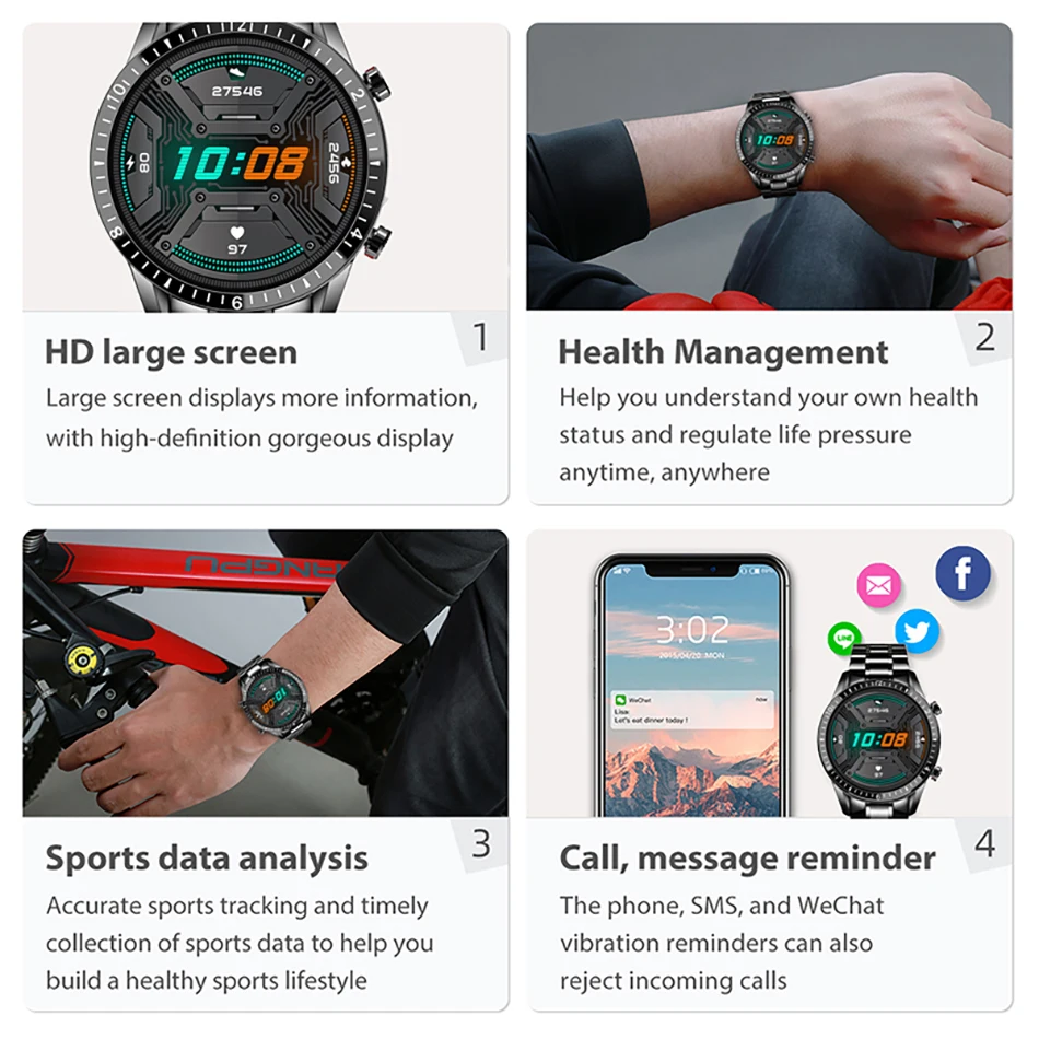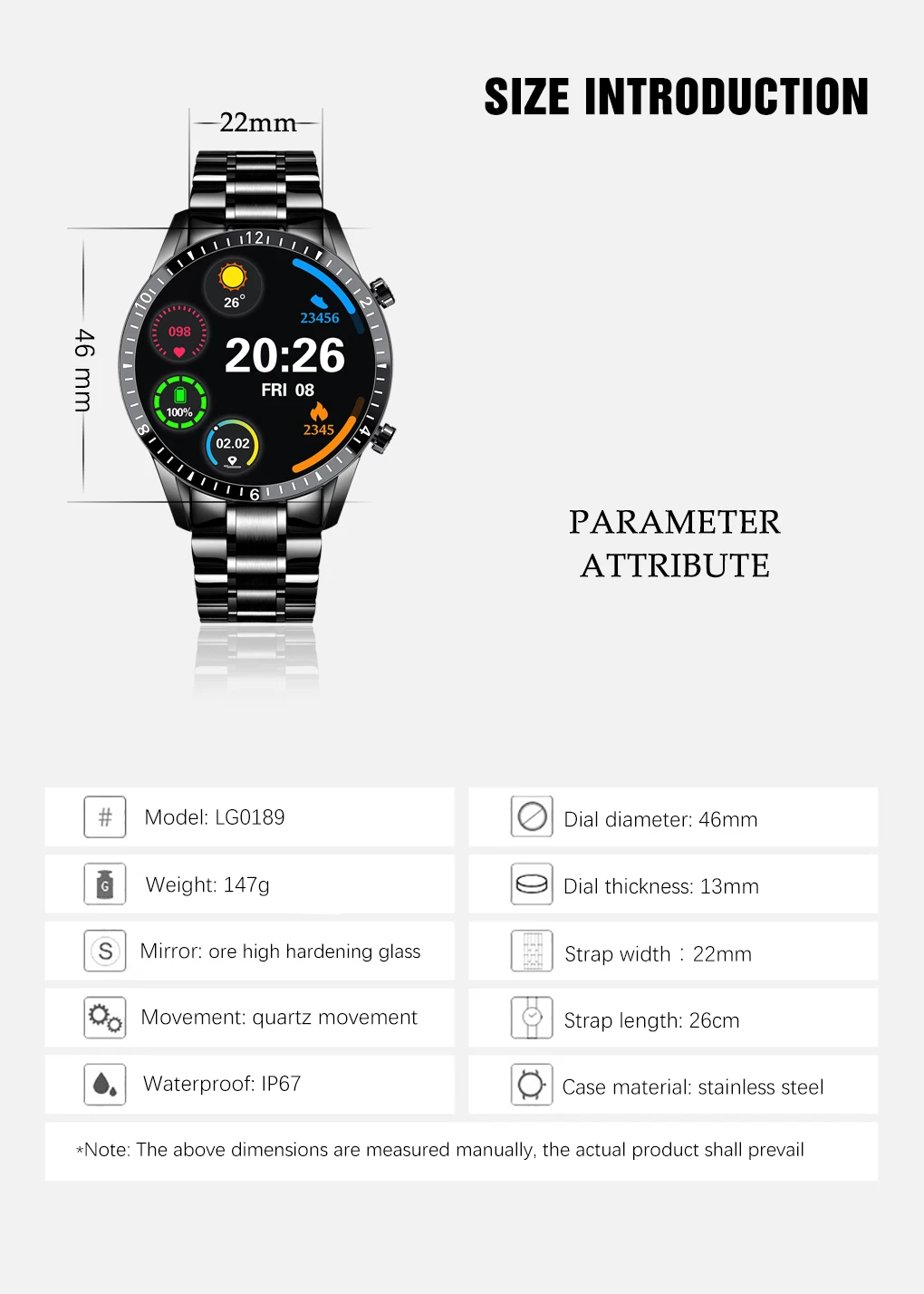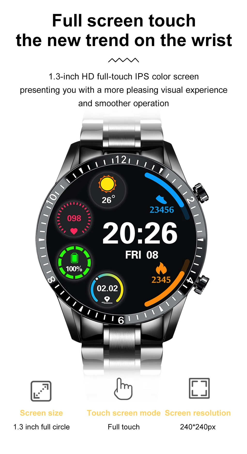 Параметры продукта:Экран: 1,3-дюймовый IPS высокой четкости full-fit круглый ЭкранСенсорная панель: Полный сенсорный экранАккумулятор: 200 мАчПриложение: WearFit 2,0Метод зарядки: Магнитная ЗарядкаВодонепроницаемость: IP67Аппаратный параметрBluetooth:BT4.0Звонки по Bluetooth: BT3.0Системы версия: Android выше 5,4IOS выше 8,0Функция программного обеспеченияПрием/отклонение телефонных звонков/телефонных звонков с циферблатом, мониторинг сердечного ритма, мониторинг кровяного/кровяного давления, мониторинг сна, напоминание о сидячем положении, шагомер/потребление калорий/запись отслеживания/время упражнений, напоминание о звонках и дисплей, сообщение толкается и отображается, камера дистанционного управления, автоматическое измерение сердечного ритма, мульти-спорт, измерение, напоминание о часах, напоминание о тревоге, 5 видов циферблатов по умолчанию. Индивидуальные Циферблаты часов в приложении являются необязательными.ЯзыкБраслет поддерживает языки: английский, китайский, испанский, французский, русский, португальский, польскийПриложение (WearFit 2,0) Поддержка языка:Английский, японский, корейский, немецкий, испанский, французский, итальянский, русский, португальский, арабский, китайский,Посылка включает в себя:Хост, зарядное устройство, ремешок на запястье, руководство, коробкаПосле получения часов сначала заряжайте. Потому что после длительного периода логистики часы имеют низкую батарею. Перед использованием отсканируйте qr-код в руководстве, чтобы загрузить приложение и подключить его к часам с помощью приложения.
