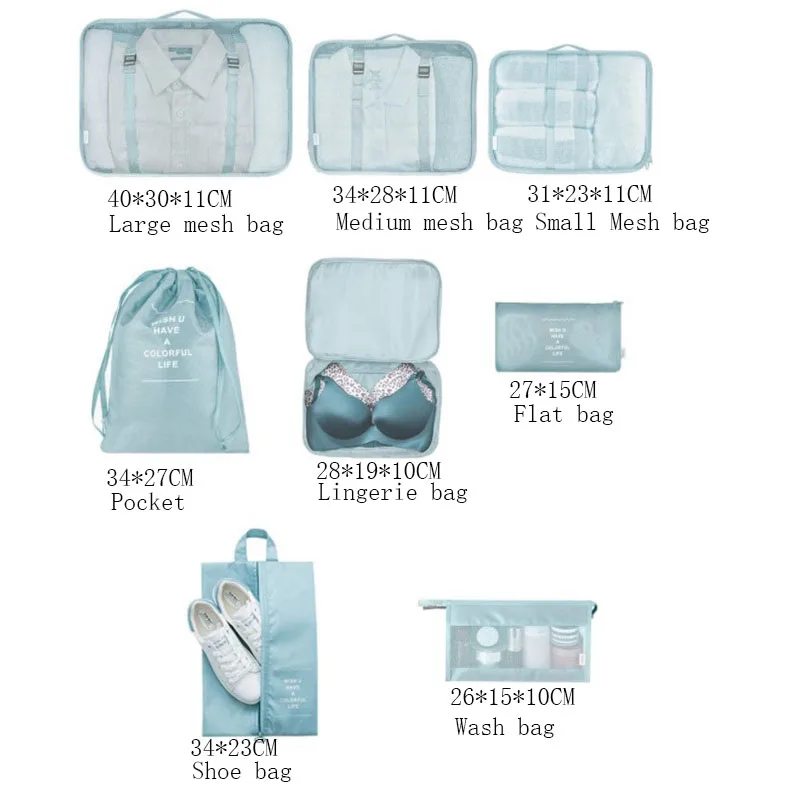Материал: саржаЦвет: серый/Корейский синий/ярко-синий/бежевый/розовый/темно-синийСпецификация: набор из 8 предметов (Использование: хранение в дороге, в спальне.