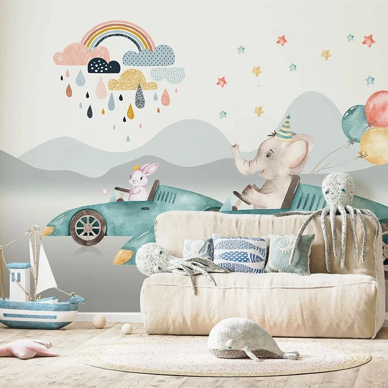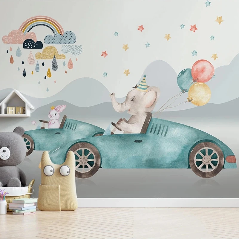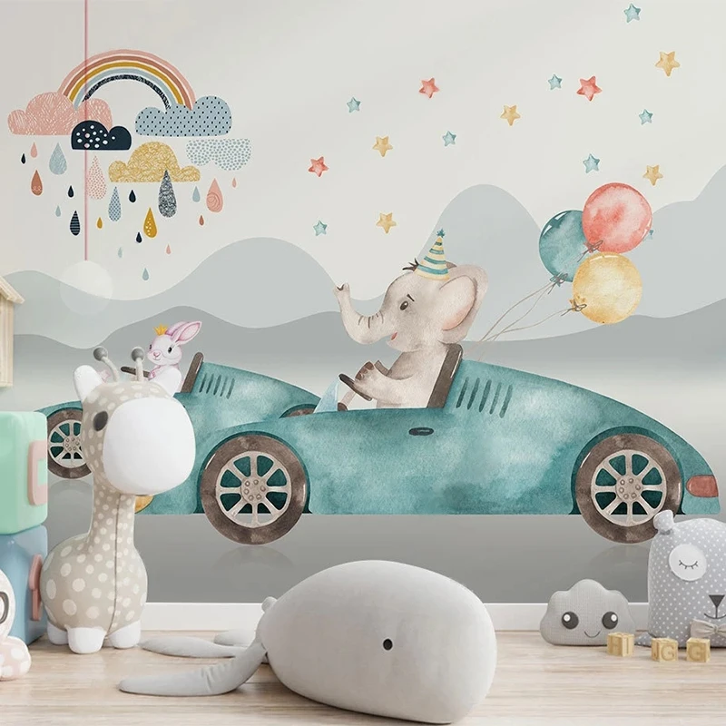 Фото обои скандинавские Ins мультфильм рисованной слон Вождение спортивный автомобиль росписи детская комната фон стены Papel де Parede 3D