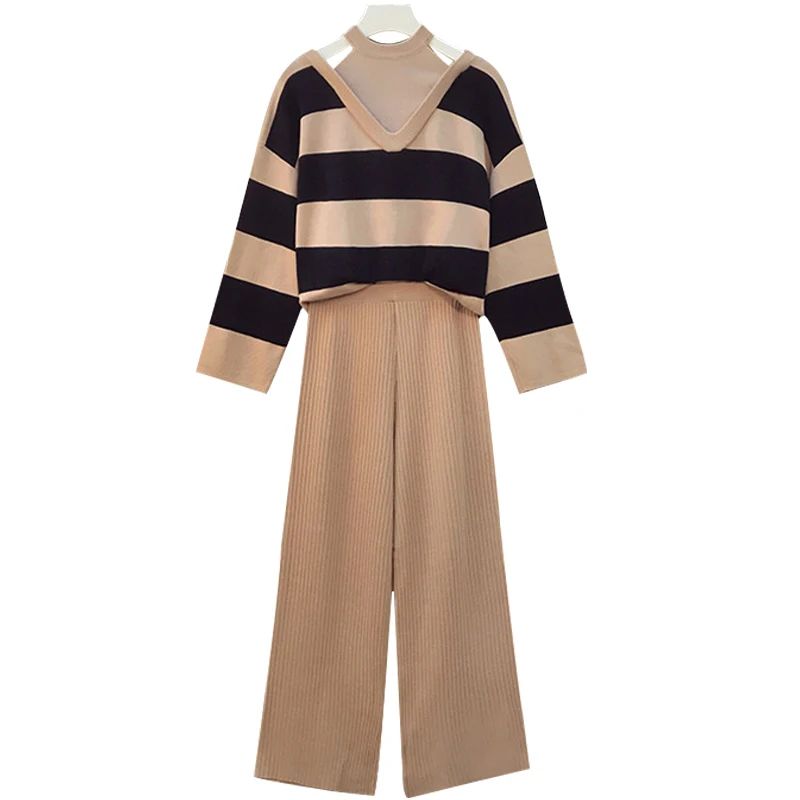 Комплект из двух предметов, Осенние вязаные женские комплекты, пикантный пуловер с длинным рукавом и принтом в полоску, свитер и брюки, спортивные костюмы, женская одежда