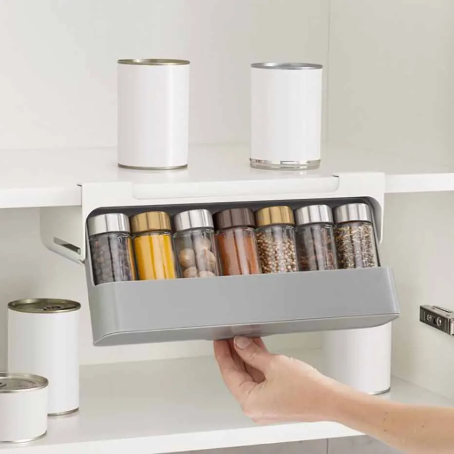 Подвесная полка для хранения бутылок для специй, подставка под шкаф, самоклеящийся контейнер для банок, органайзер для бутылок с приправой в виде ящика
