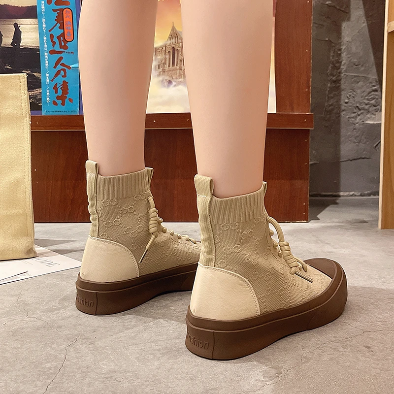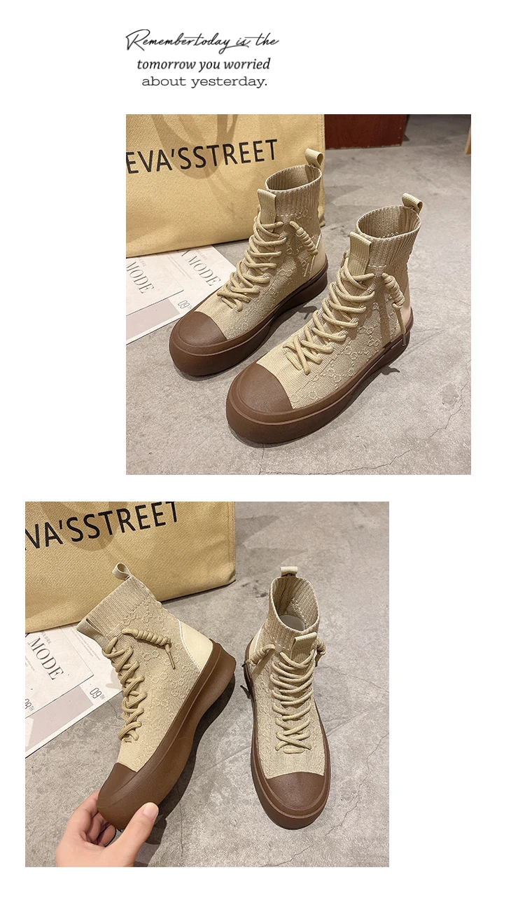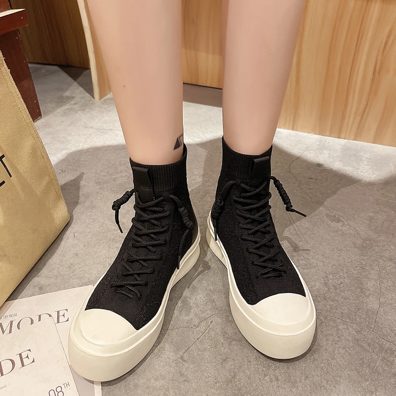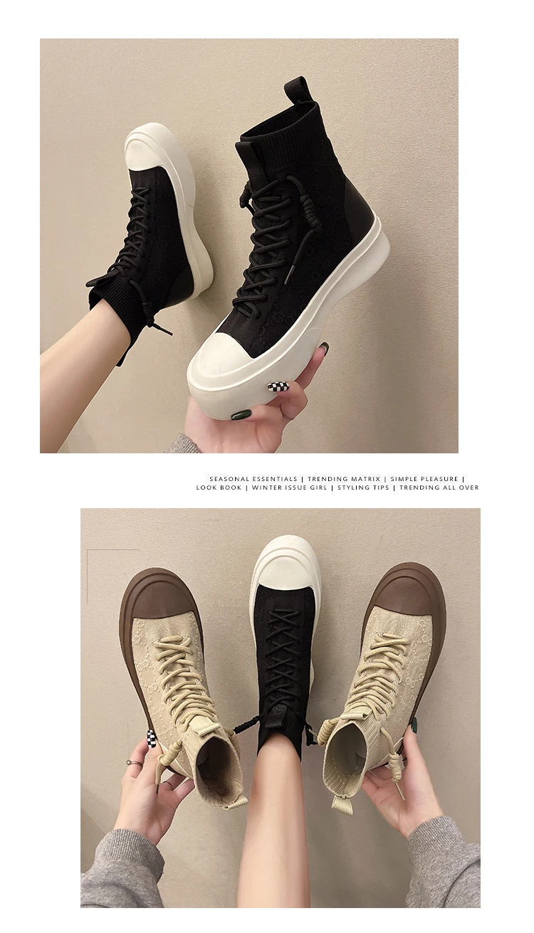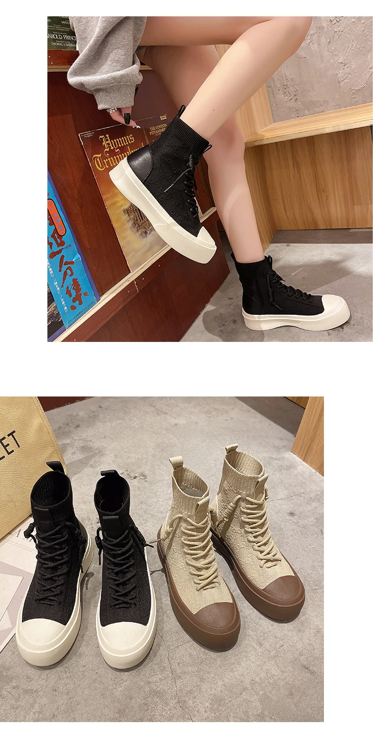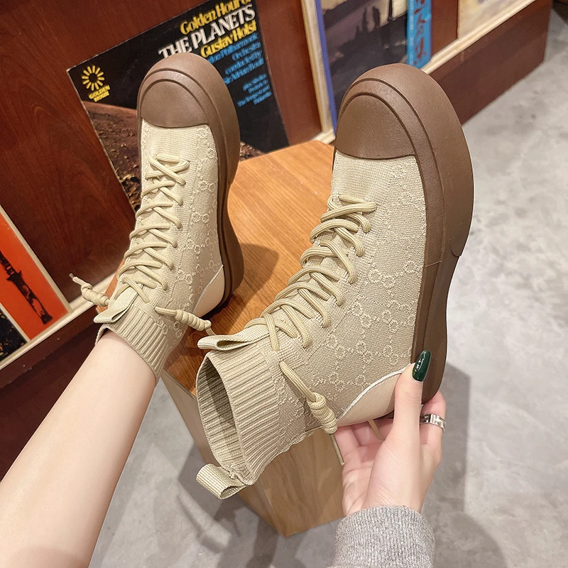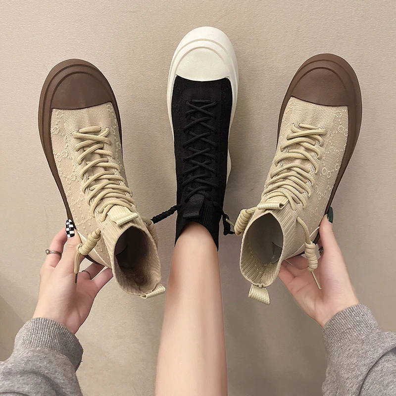 Женские высокие сапоги из эластичной ткани на шнуровке, сезон весна-осень 2021, повседневная Студенческая женская обувь для отдыха, сапоги с массивной подошвой и круглым носком