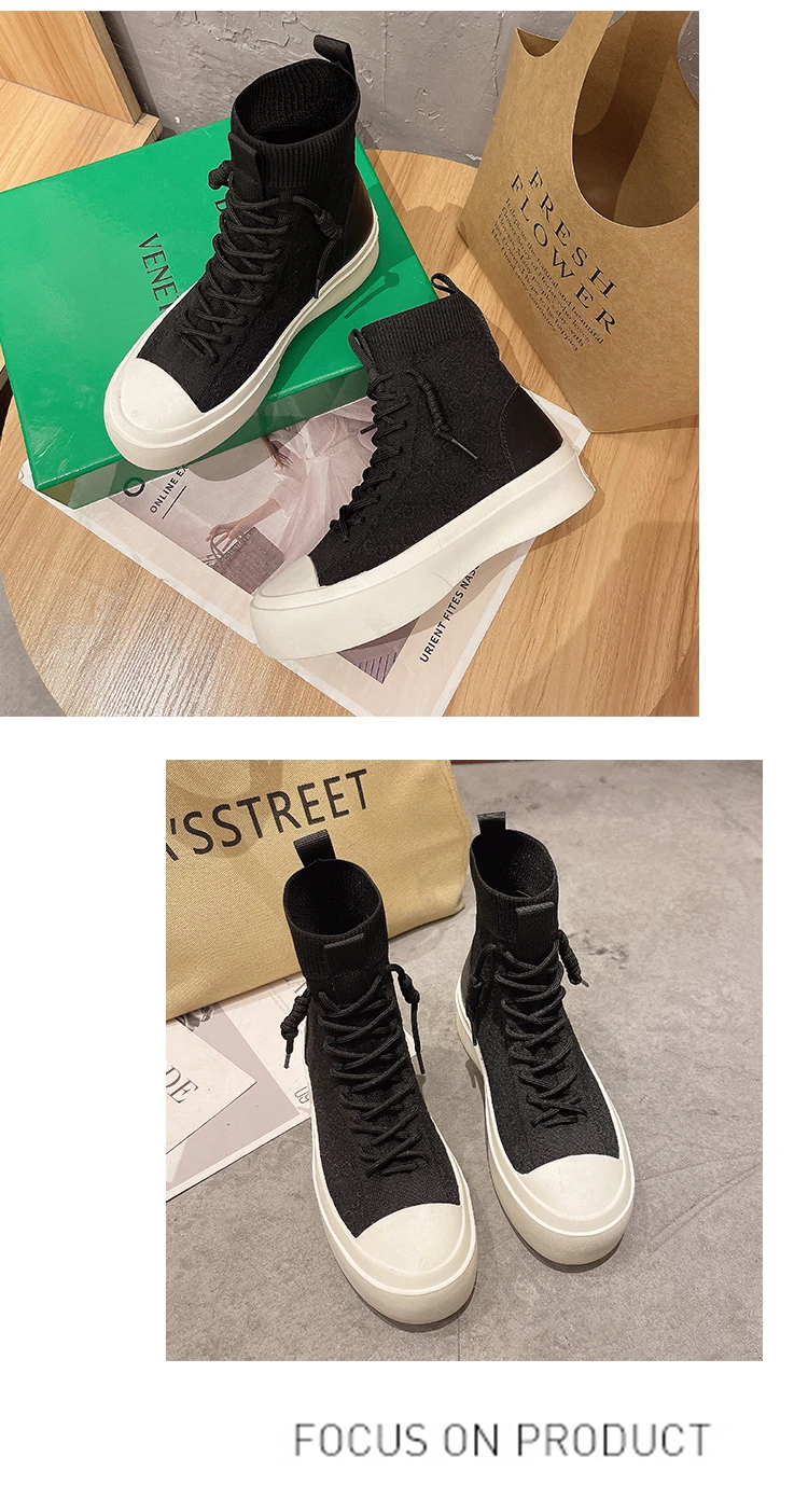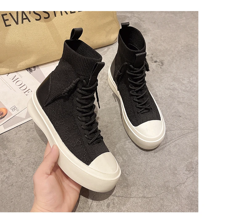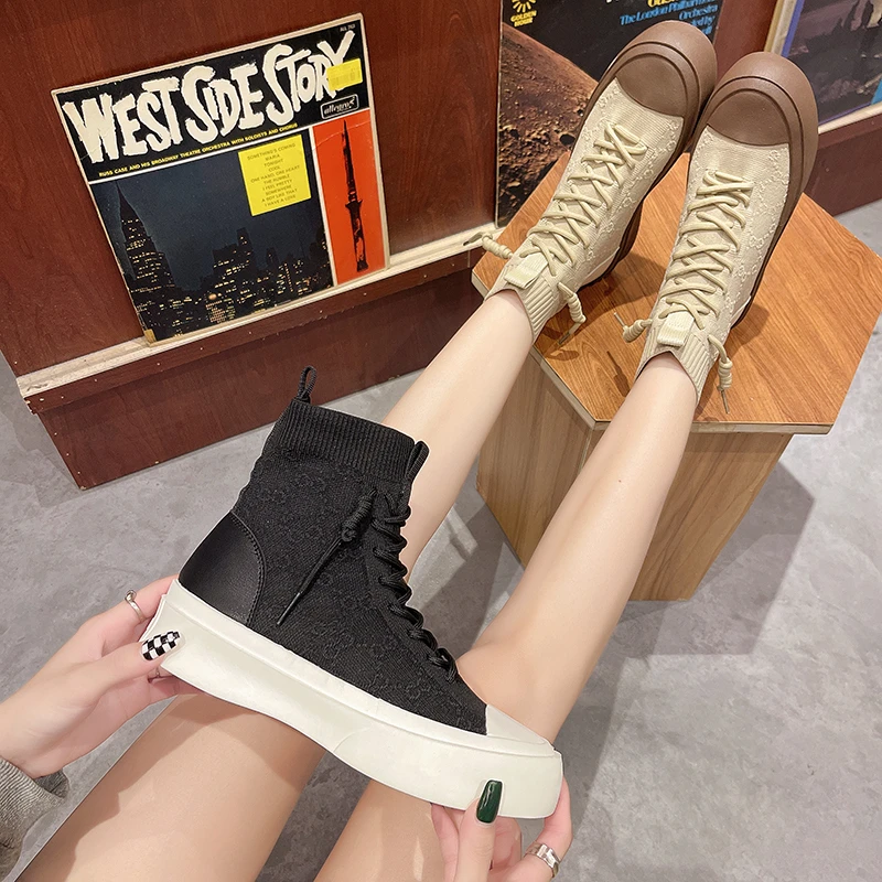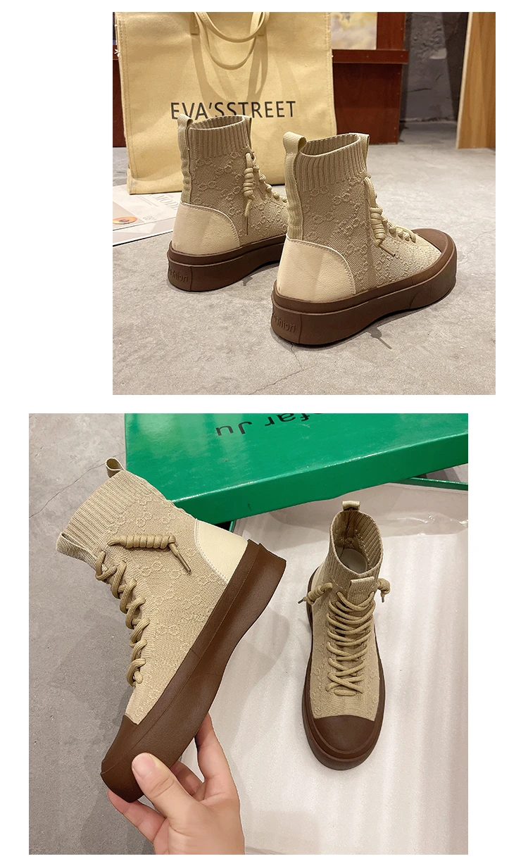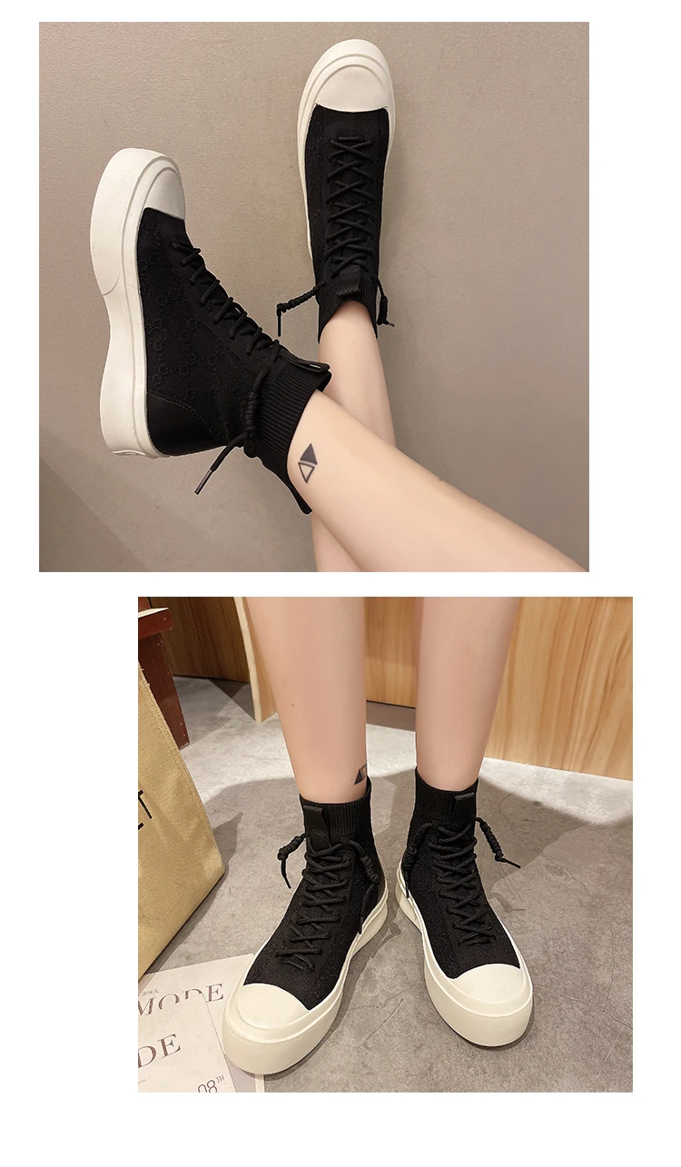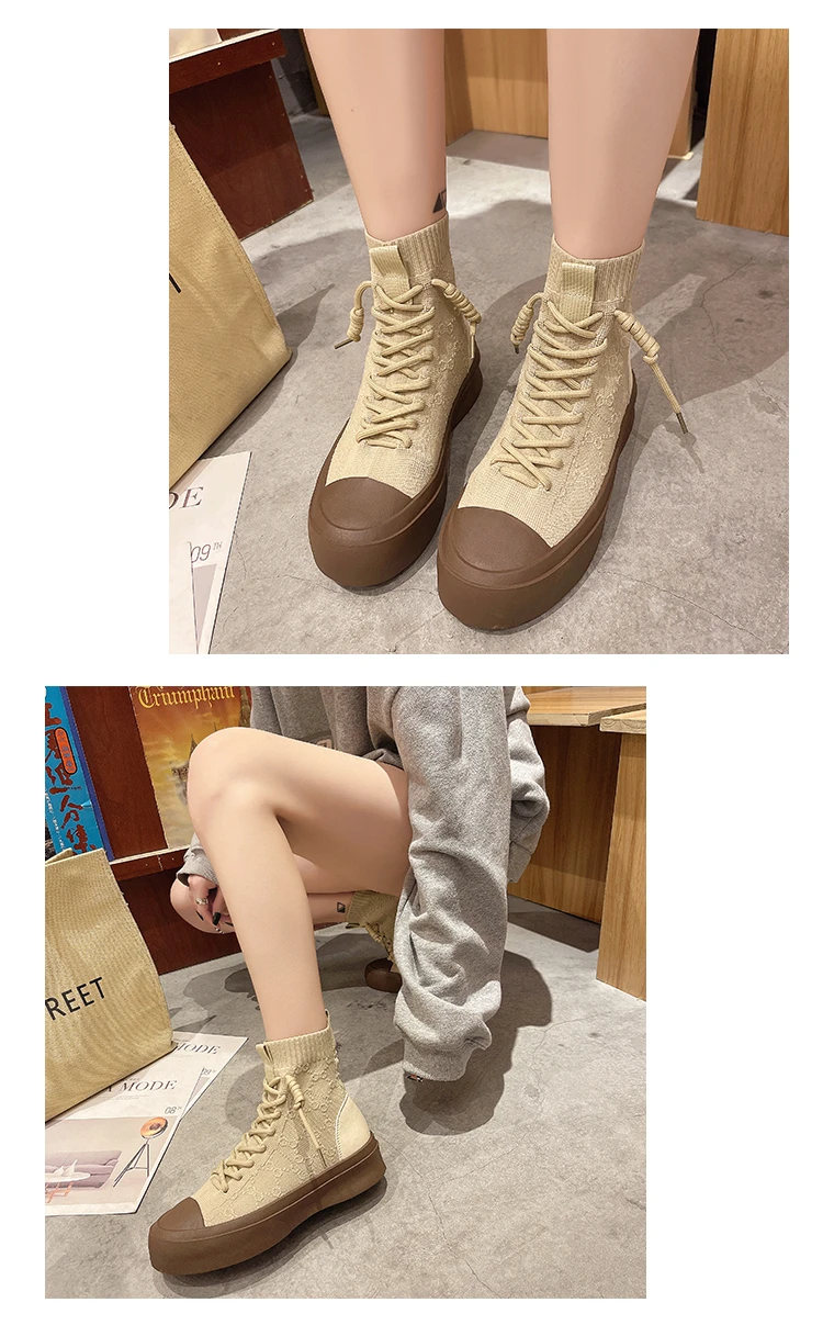 Женские высокие сапоги из эластичной ткани на шнуровке, сезон весна-осень 2021, повседневная Студенческая женская обувь для отдыха, сапоги с массивной подошвой и круглым носком