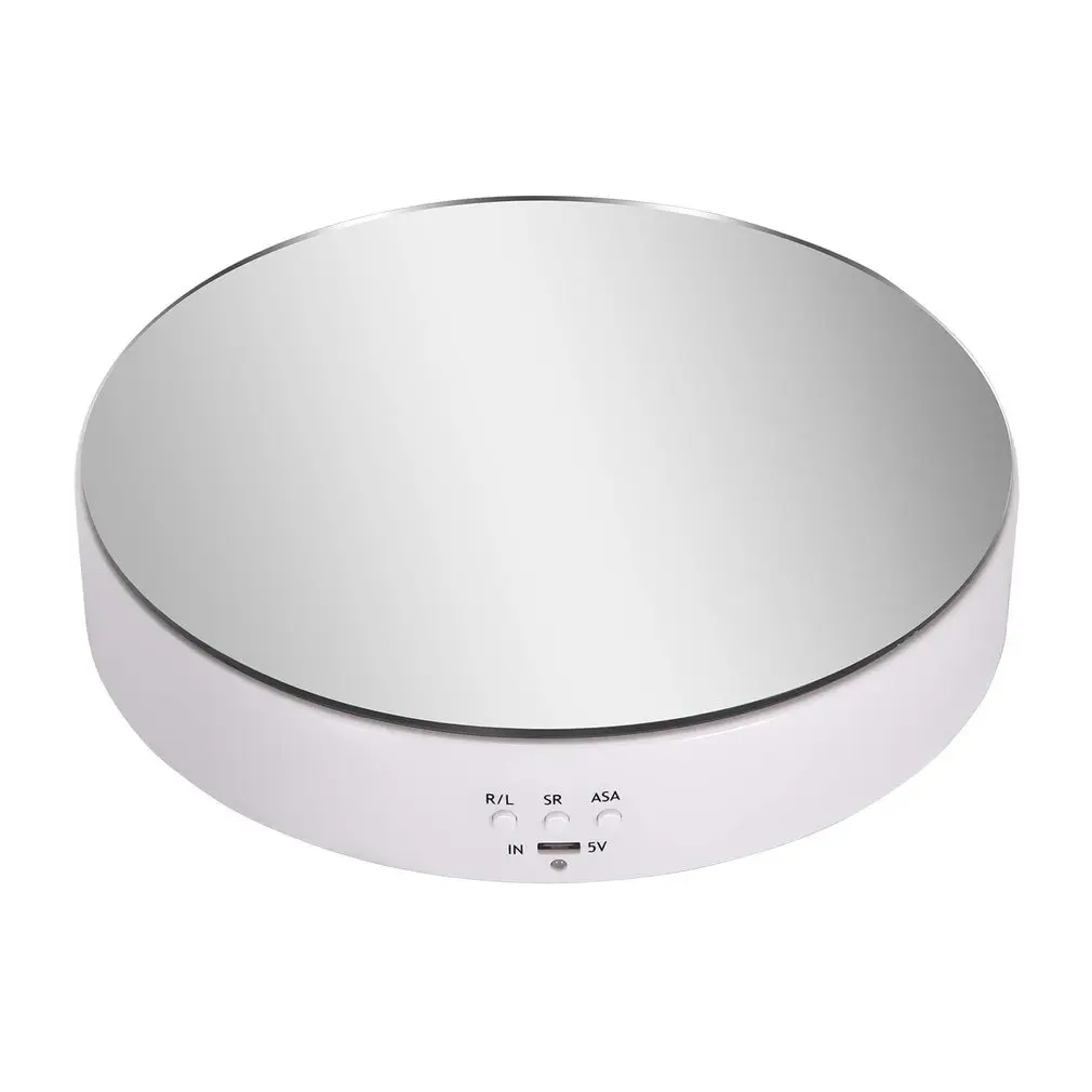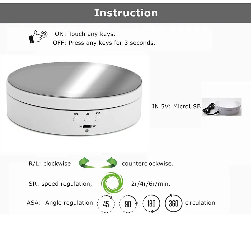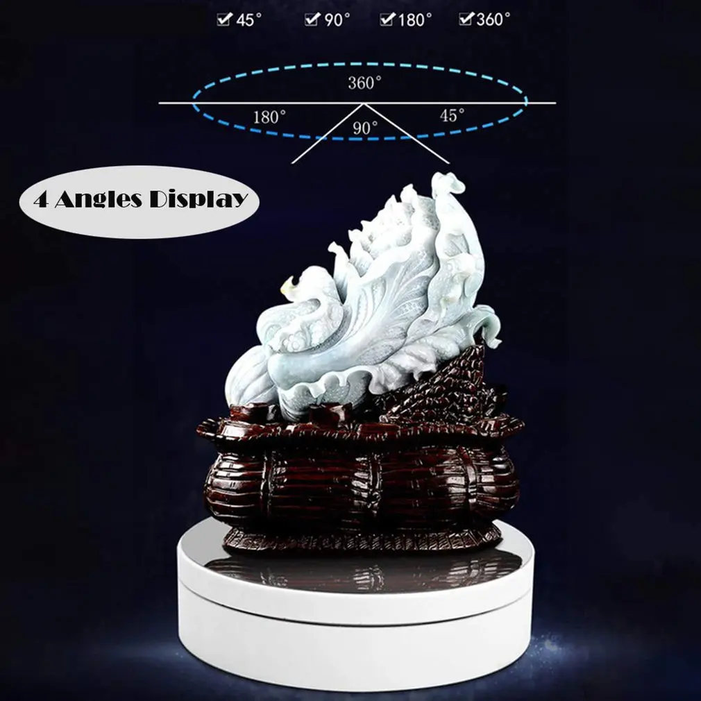 Спецификация:Три скорости: 2/4/6 об/мин (в минуту)Вес подшипника: 4 кг, 3 кг, 2 кг.Углы поворота: 45/90/180/360 градусов.Направление поворота: по часовой стрелке/против часовой стрелкиИсточник питания: AAA батареи/USB вход/18650 аккумуляторная батарея. (Не включая аккумулятор)Материал: АБС-пластикДиаметр: прибл. 13,8 см/5,43 дюймаВысота: прибл. 3,5 см/1.38inЦвет зеркала: черный, белыйКоличество: 1 комплект
