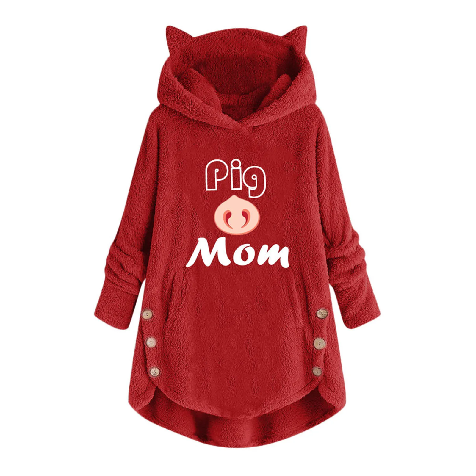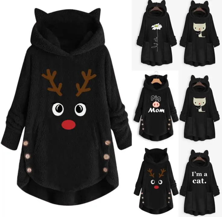 Толстовка женская с капюшоном, Свитшот оверсайз с кошачьими ушками, бархатный пуловер средней длины, Рождественская теплая Домашняя одежда с капюшоном, W5