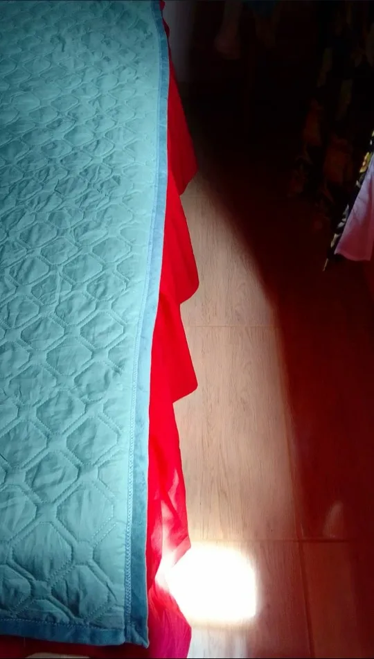 Получила покрывало доставкой курьером.Очень довольна покупкой этого товара.Покрывало двойное.Подкладка другого цвета.Всё сделано очень хорошо.Ни одной ниточки не торчит.Особая благодарность за 2 наволочки.Они такие же как покрывало.Сзади на молнии.По периметру голубой кант.Сделаны точно по размеру.50 на 70.Я взяла покрывало 200 на 230.Но можно было бы взять и 230 на 250 На кровать 200 на 160 впритык.Я продавца рекомендую.Покрывало отличное.Покупайте,не пожалеете.Спасибо.Да,цвет как на картинки.Размер точный.