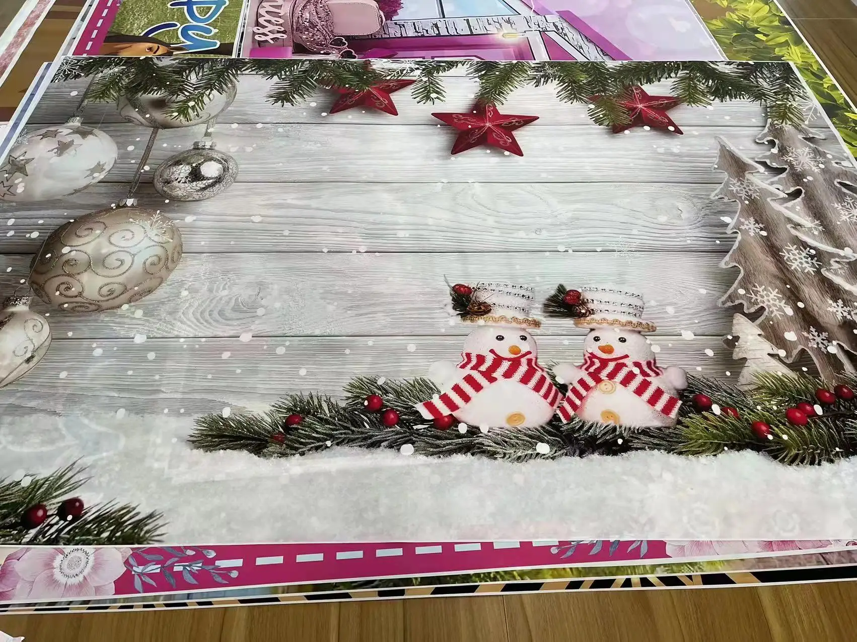 Фон для фотосъемки с изображением белого Дерева Рождественского сарая деревянного пола красные звезды ветки сосны снежинки зимы снеговика