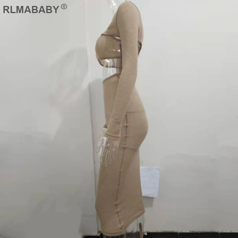Женское трикотажное платье-миди с длинным рукавом и открытой спиной