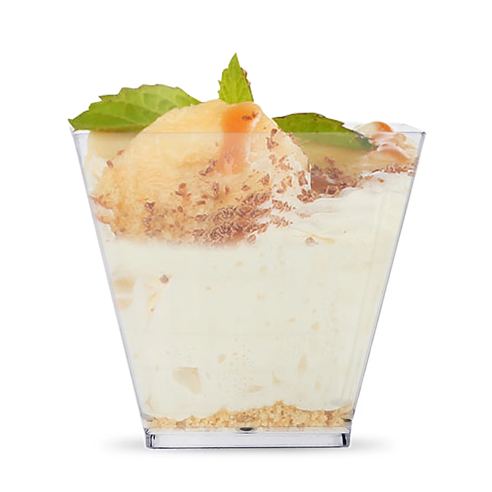 Этот продукт включает в себя 50 штук чашек, изготовленных из пищевого пластика. Порционные чашки безопасны и прочны. Кроме того, они не протекают, поэтому, как только вы накроете пластиковые стаканчики вместе с ними, ничто не прольется или не упадет. Вы можете использовать их для хранения шоколадного мусса, фруктовых салатов и небольших закусок.