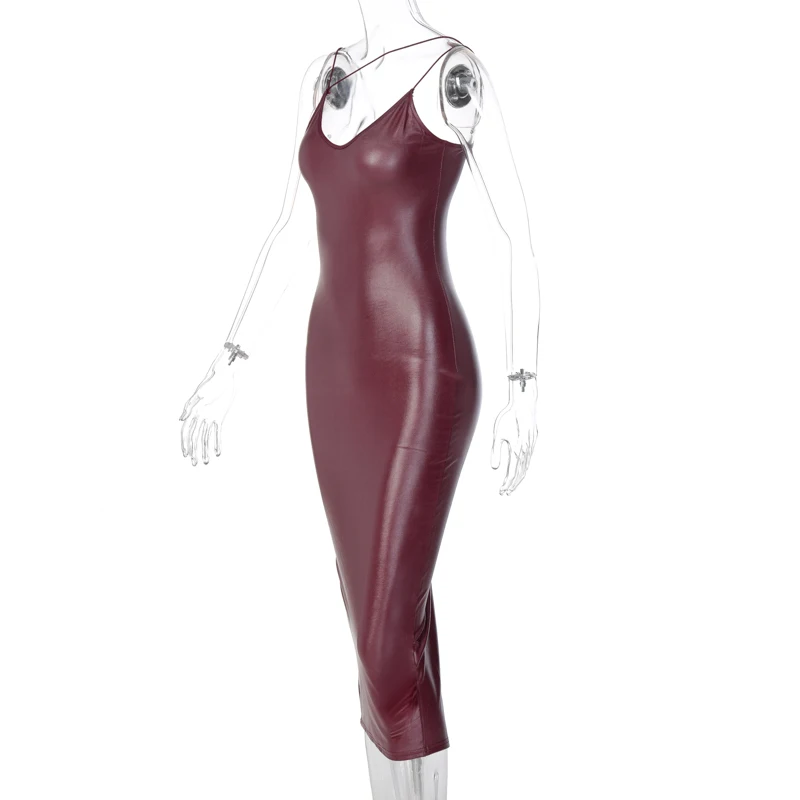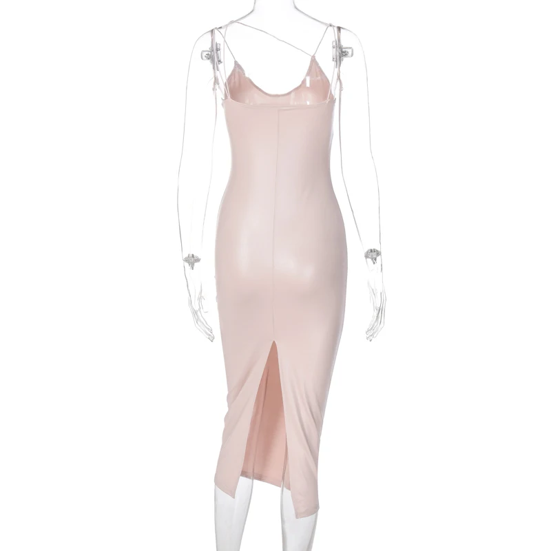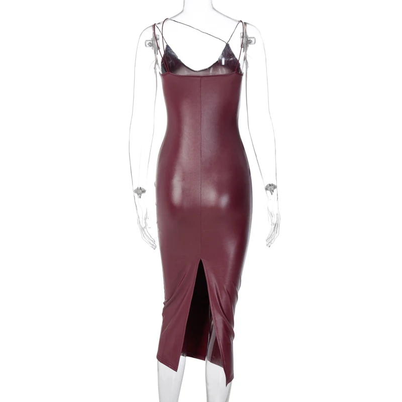 Женское платье-миди из искусственной кожи, с разрезом, V-образным вырезом и открытой спиной