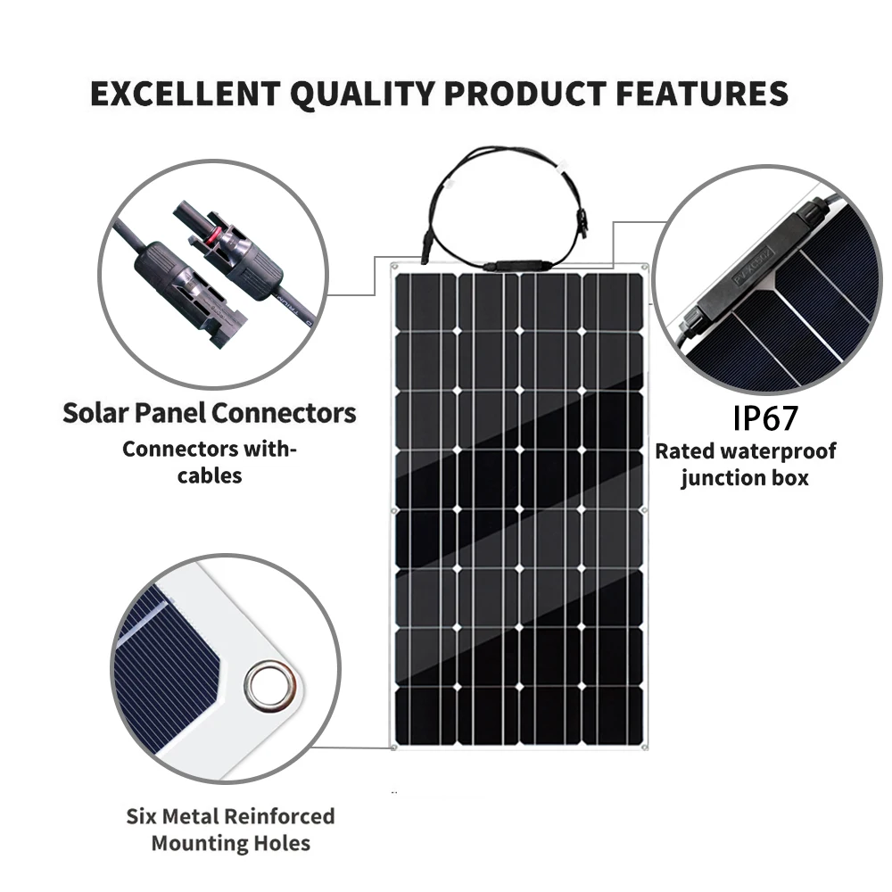 ● ГибкостьОсновным преимуществом гибкой солнечной панели является ее адаптируемость. Поскольку он гибкий, его можно разместить на любой данной поверхности, независимо от материала поверхности. Его можно поместить на изогнутую крышу или выровненную платформу, когда вы хотите собрать энергию солнца, пока вы находитесь на тропе, или если вы путешествуете и отдыхаете в походе с решеткой!●LIGHTWEIGHTЭта лучшая Гибкая солнечная панель для rv обычно легкая, что означает, что это не будет хлопот, чтобы выйти на дорогу. Эта панель солнечной энергии легче выводить для использования, так как ее довольно легко хранить.● БезрамноеИз-за его 0,1 дюйма толщина и весом всего 4,45 фунтов, 100w flexble солнечная панель имеет уникальный безрамочный дизайн. Вы можете закрепить на нужной поверхности клеем, лентой, втулкой или липучкой. Эта конструкция обеспечивает легкую установку. Шесть металлических усиленных крепежных отверстий для фиксации винтов, подвешивания и снятия панели, обеспечивая легкую транспортировку.● МощныйИспользуя высокоэффективные монокристаллические элементы, эта солнечная панель более эффективна, чем многие средние устройства на рынке. Кроме того, он поставляется с интегрированным блокирующим диодом, который помогает предотвратить сброс обратного тока, особенно в ночное время. Это обеспечивает оптимальные уровни эффективности.