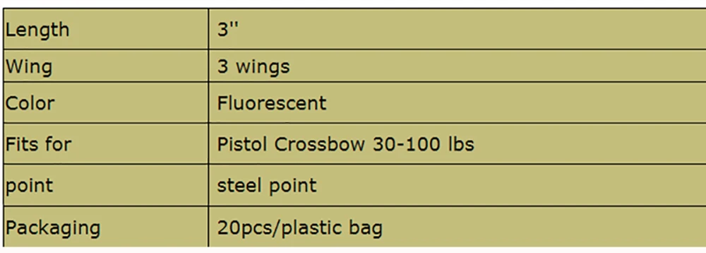 Описание:Длина: 7,1 см, вес около 2,79 дюймовДиаметр: 0,75 см, вес около 0,295 дюймовТип: три лопастиЦвет: желтыйИспользование: для пистолета арбалетаТип: стрелаМатериал вала: алюминийМатериал пера: пластикТочечный Материал: стальИспользование: съемкаID:4 ммДиаметр: 6 ммВес: 10 г (154гр.)Тип наконечника стрелы: Тип винтового поляДлина вала: 78 смВал ТПЭ: вал пултрузииЗаказ образца: Да, хорошоПодставка для установки оперения на материал: 3 дюймов)Точечный Материал: alu