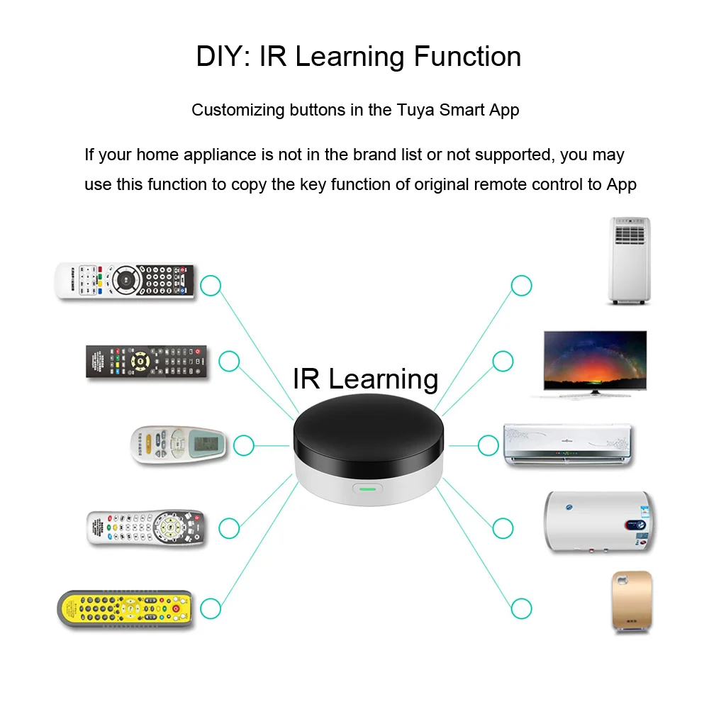 Пульт дистанционного управления AppДистанционное управление бытовой техникой с помощью приложения «Tuya Smart» в вашем мобильном телефоне, где бы вы ни находились. Например: Включите home A/C заранее, наслаждаясь комфортной температурой, как только вы вернетесь домой. Голосовое управлениеПри подключении интеллектуального динамика, такого как Amazon Echo, Google Home, вы можете управлять голосом вашей бытовой техники. Например: Alexa, Включите телевизор; Ок Google, установите температуру кондиционирования воздуха до 25 градусов. Сценарий и автоматизация в приложенииСценарий состоит из 1 или более действий. Создав «Сценарий», вы можете управлять несколькими устройствами одним нажатием; Добавляя «автоматизацию» и взаимодействуя с другими устройствами smart home, пульт дистанционного управления Wi-Fi может выполнять действия автоматически в соответствии с такими условиями, как состояние устройства, погода и время. Imer и Автоматический триггерСогласно вашим привычкам жизни, установите переключатели времени для вашей бытовой техники, такие как включение/выключение кондиционера через регулярные промежутки времени. Сделай СамНастройка кнопок в умном приложении Tuya, если ваш бренд бытовой техники не входит в список или не поддерживается. Третий-вечерние контроль:Работает с Amazon Alexa, Google Assistant, Siri(iOS 12,0 или более поздней версии), Tmall Genie, Tecent Xiaowei, DingDong, Rokid, DuerOS и т. д.* Дружеское напоминание: не работает с IFTTT.