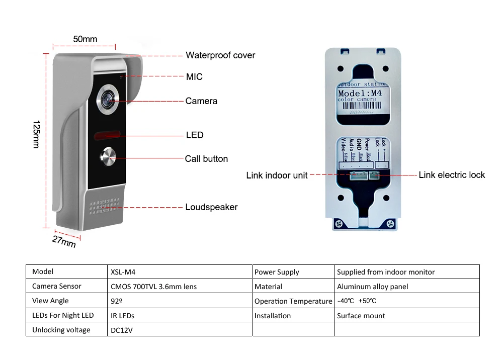 Наружный дверной звонок изготовлен с металлической передней панелью для защиты от вандализма, в то время как Водонепроницаемость защищает от дождя или снега. С защитой от дождя, чтобы предотвратить попадание воды и защитить наружную камеру от повреждений.