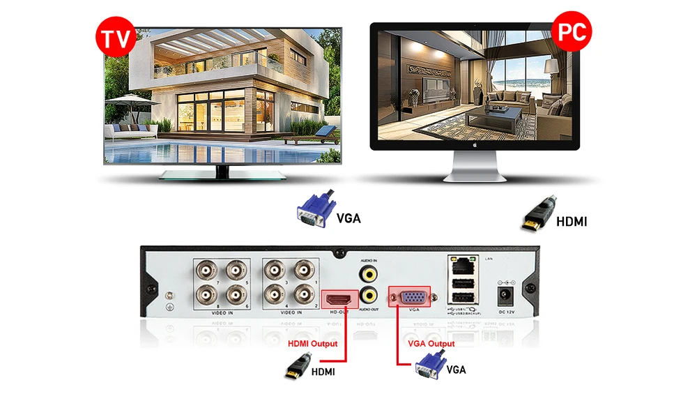 Просмотр на мониторе HDMl легко отображает видео через порт HDMI вашего монитора компьютера, чтобы в полной мере воспользоваться ясностью системы безопасности. (кабель HD не входит в комплект)Просмотр на телевизоре или мониторе ПК для дополнительного удобства, видеорегистратор также поставляется с подключениями VGA и BNC для стандартных вариантов просмотра разрешения.(Кабель VGA или BNC к RCA не входит в комплект.)