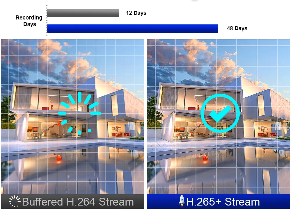 H.265 более четкий, HD разрешение предлагает вам лучшее качество изображения в более низкой скорости. Экономьте больше места для хранения, вы можете уменьшить размер файлов 40%-50%, сэкономить место для хранения HDD и снизить стоимость покупки.