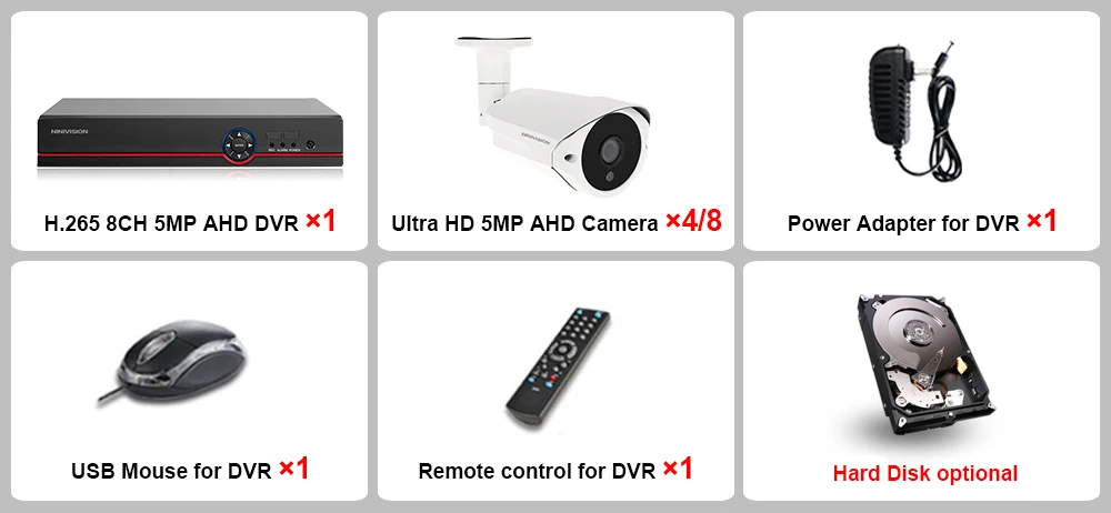 1 х 8-канальный H.265 AHD 5MP DVR NVR HVR 6 в 1 цифровой видеорегистратор;4/8 x HD 5.0MP Крытый Открытый ИК День ночного видения атмосферостойкие камеры;1 х адаптер питания для DVR;1 X USB мышь для DVR;1 пульт дистанционного управления для DVR;1 X CD программное обеспечение для DVRЖесткий диск опционально!