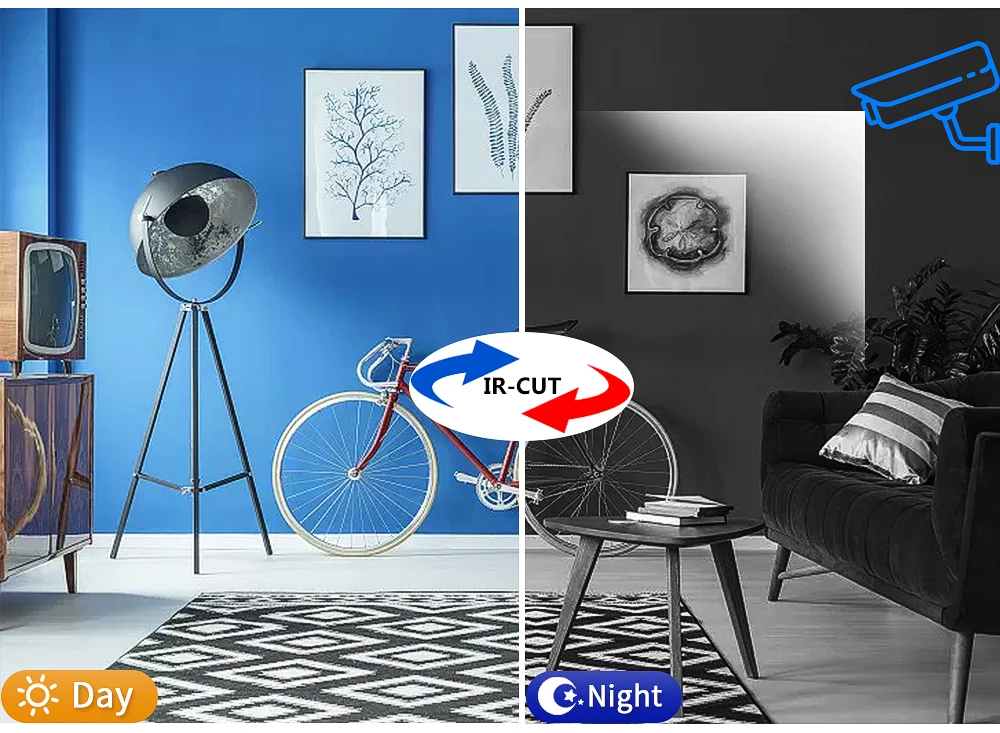 Умный фильтр, отсекающий ИК-спектр автоматически переключается между днем и ночью, цвет toreduce в дневное время и повышает яркость изображения в ночное время. Вы можете получить яркие кадры наблюдения от рассвета до темноты.