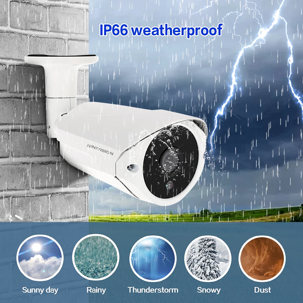 Используйте их в качестве наружных камер или крытых камер, так как они построены жестко, выдерживает любую погоду: дождь, снег, пыль и жаркие дни. С защитой от атмосферных воздействий IP66 и кабелями, просвечивающимися через подставку для защиты, гарантируем, что вы сможете ответить на их производительность, день в день. Наша камера имеет сверхпрочный металлический корпус, профессиональный IP66, устойчивый к атмосферным воздействиям, обеспечивая стабильную производительность как внутри, так и снаружи.