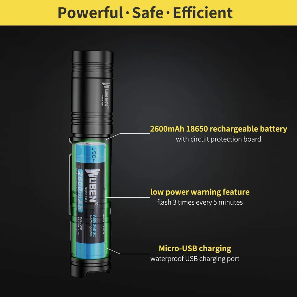 -Мощность: перезаряжаемая литий-ионная батарея WUBEN 18650 (входит в комплект) или 2 батареи CR123A (не входят в комплект)