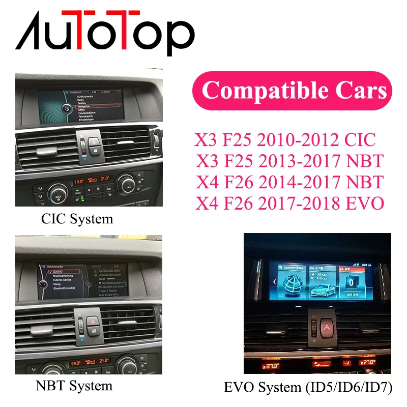 BMW X3 F25(2010-2013) оригинальная система CICBMW X3 F25(2013-2017) оригинальная система NBTBMW X4 F26(2014-2017) оригинальная система NBTBMW X4 F26 2017 оригинальная система EVOДля 12,3 дюйма версии, она подходит для левый руль и правый руль автомобиля.Для версии 10,25 дюймов, подходит только для левого привода автомобиля.Если вы не уверены в автомобильной системе, вы можете связаться с продавцом за помощью, прежде чем сделать заказ.