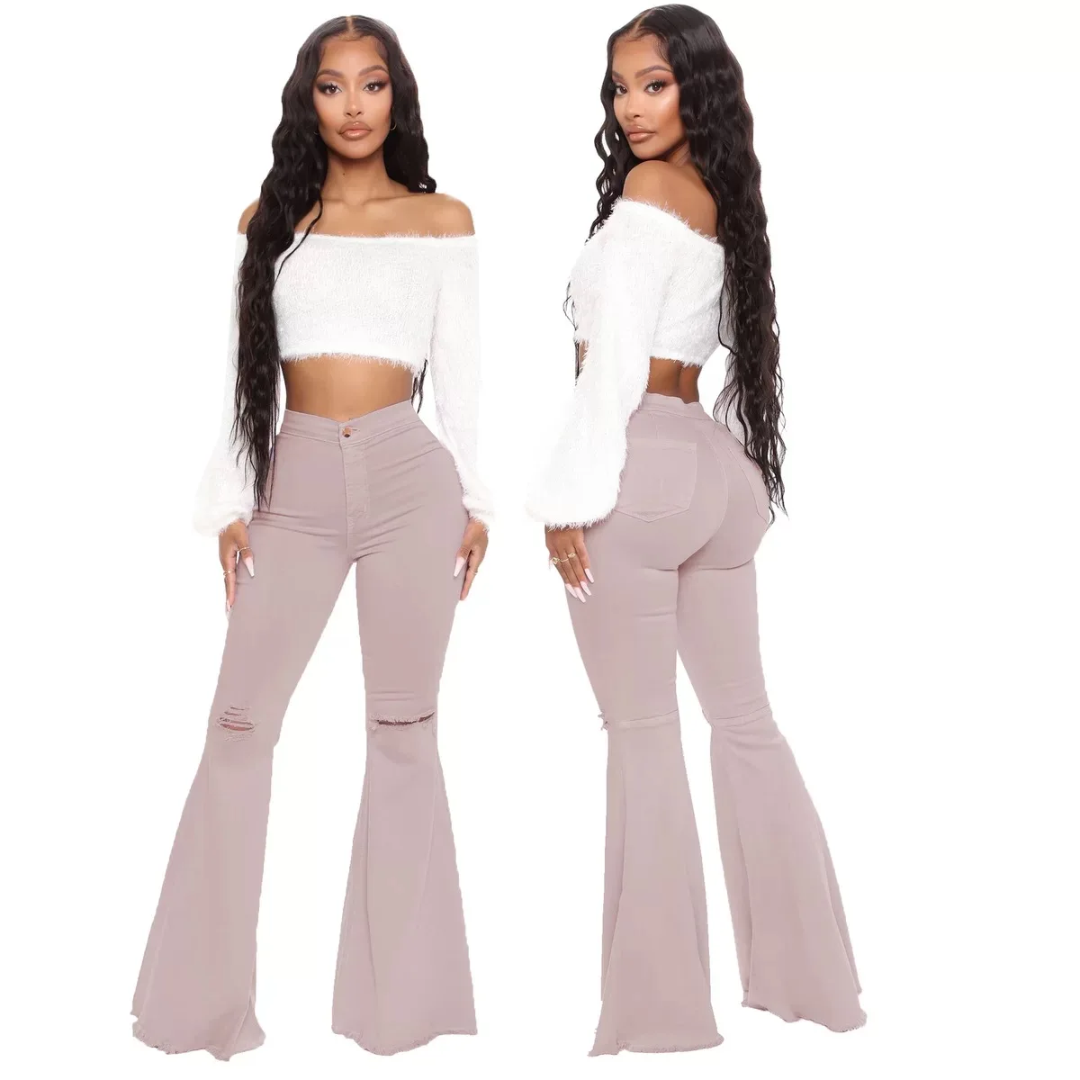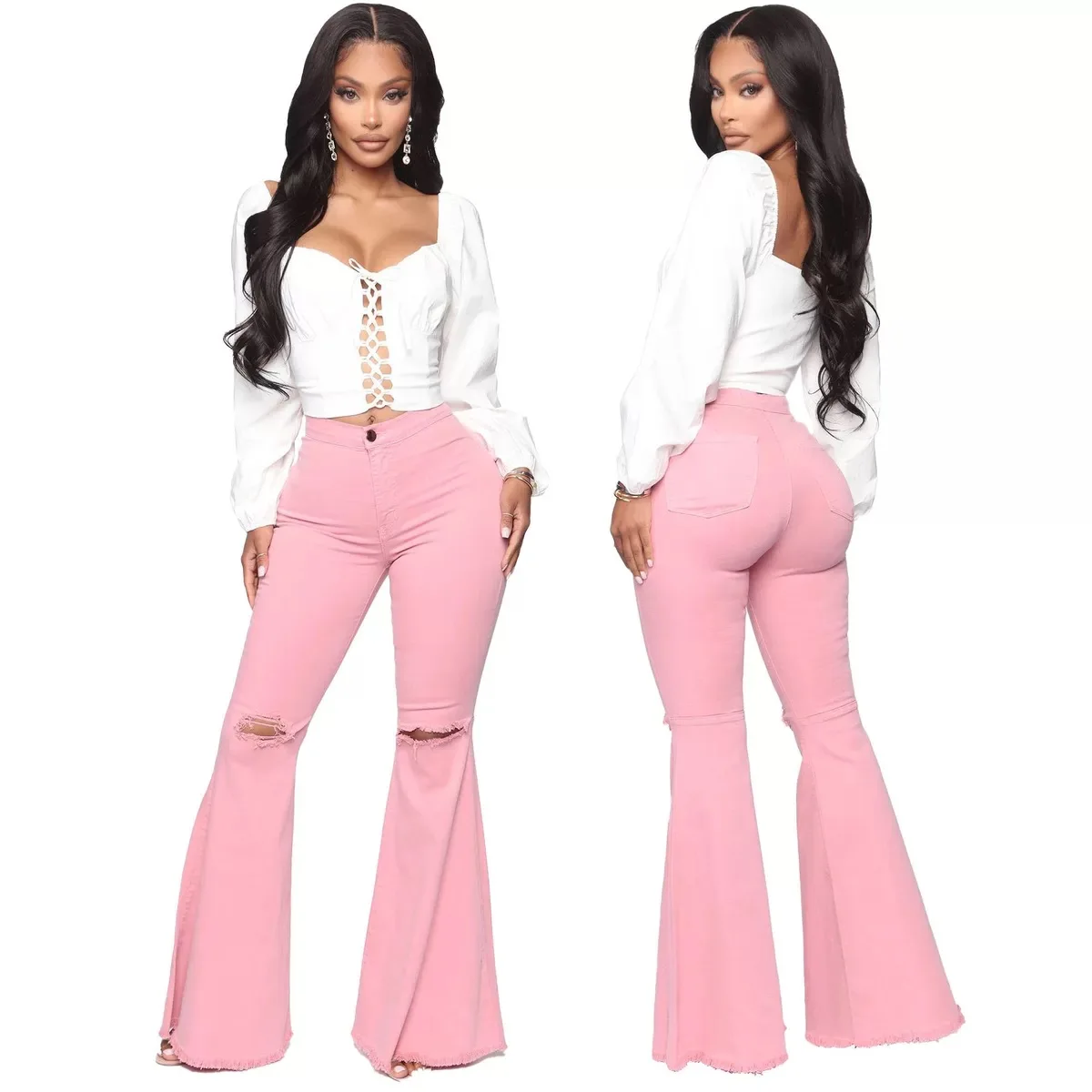 Женские модные широкие брюки с высокой талией, эластичные расклешенные брюки темно-синего цвета, рваные джинсы