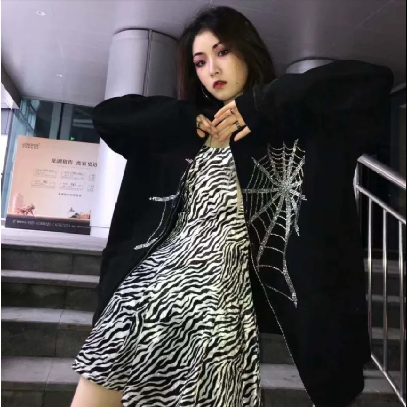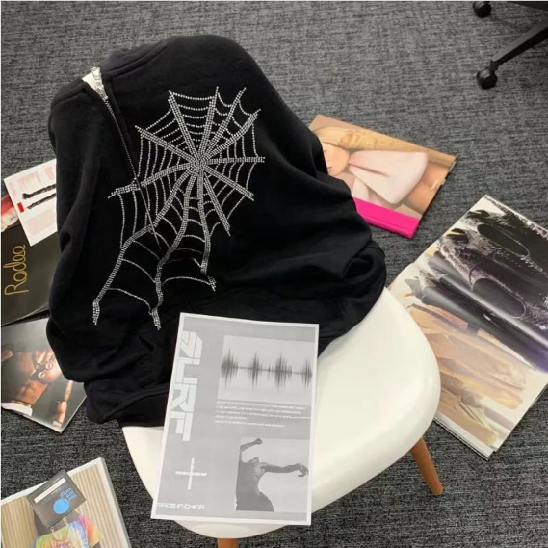 Женская толстовка с капюшоном Y2K, Готическая Толстовка стразы, паутина, на молнии, в стиле Харадзюку, большие размеры, осенняя уличная одежда, свободная куртка с капюшоном