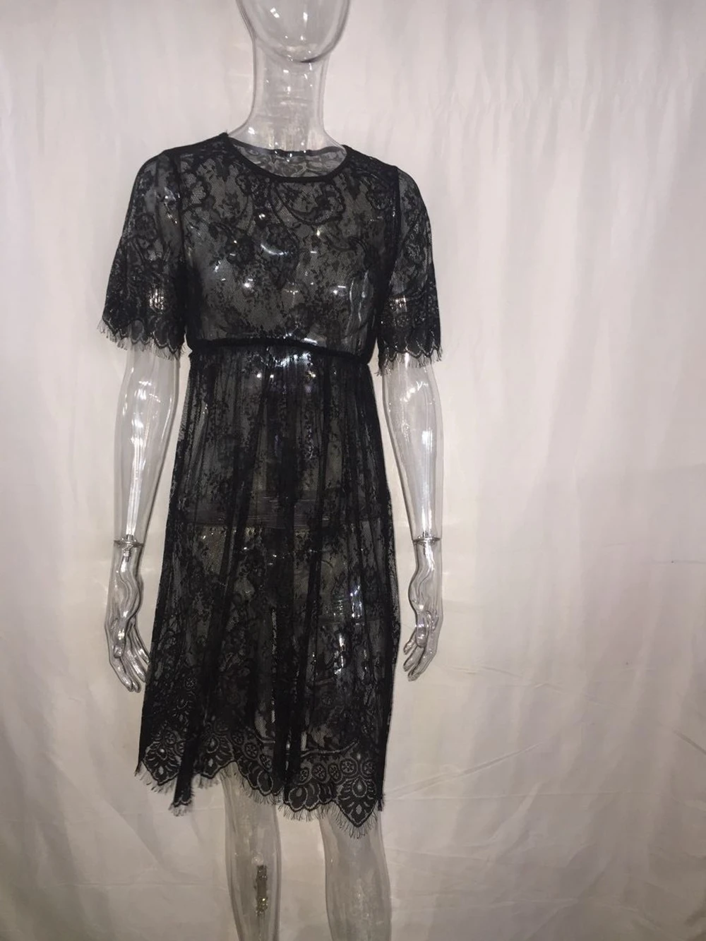 Женские кружевные платья, летние однотонные пляжные платья в стиле бохо с круглым вырезом, уличная одежда с оборками и коротким рукавом, трапециевидный мини-сарафан с запахом, вечернее платье