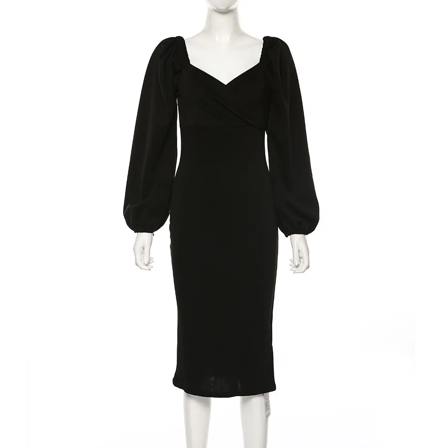 Женское платье с открытыми плечами, соблазнительное облегающее однотонное платье с V-образным вырезом и рукавами-фонариками, элегантное вечернее платье средней длины на Рождество, черное платье, 2021