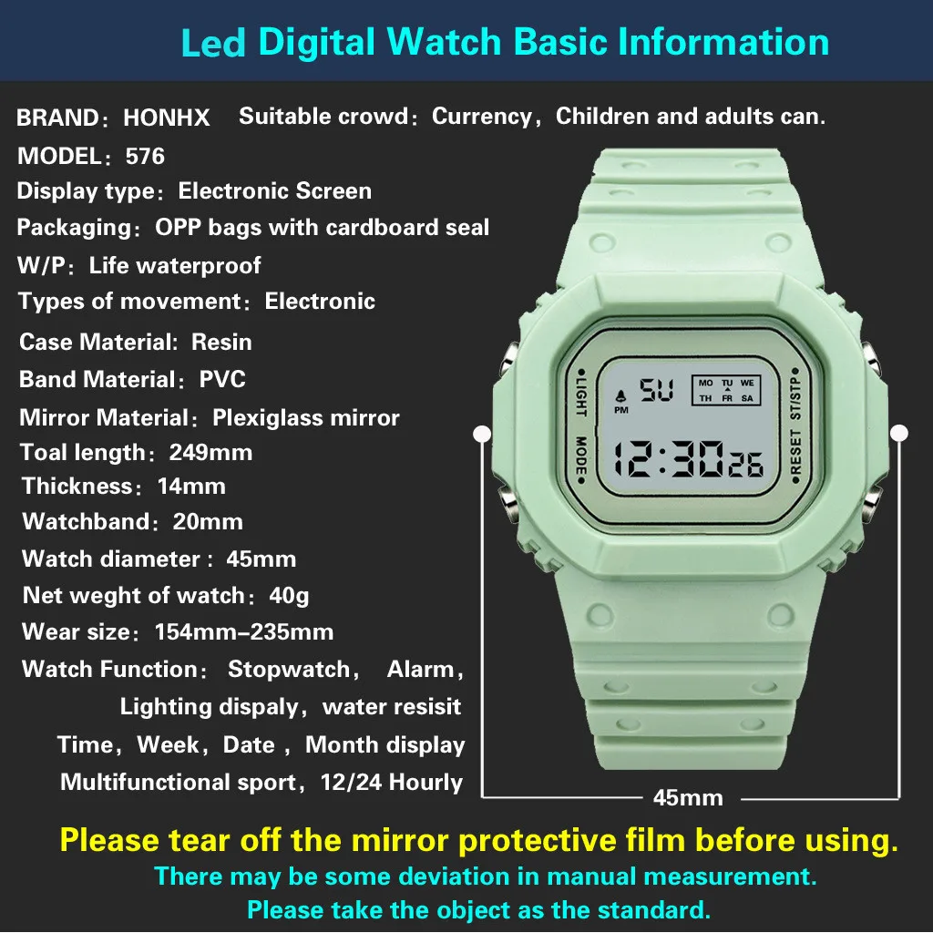 Длина ремешка: 24 смШирина ремешка: 2,4 смДиаметр циферблата: 3,8 смТолщина циферблата: 1,0 смЧехол Материал: АБС-пластик, высокопрочного пластикаМатериал ремешка: мягкий эластичный ПВХМатериал зеркала: анти-капля и высокая проницаемость импортного акрилаФункция часов: секундомер, будильник, ежечасное напоминание, отображение светящейся даты, преобразование 12/24 часов, водонепроницаемость, отображение времени, отображение неделиПосылка1 часы(Водонепроницаемость) можно только брызгать немного воды, нельзя мыть или купаться, плавать, нырять.
